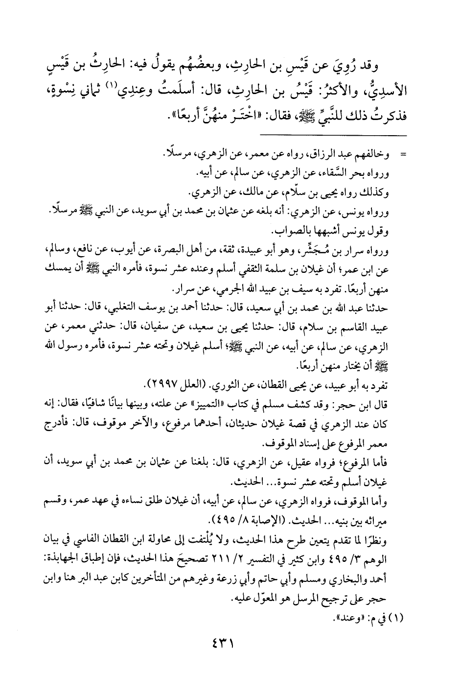 وقد رُوِيَ عن قَيْسِ بن الحارِثِ، وبعضُهُم يقولُ فيه: الحارِثُ بن قَيْسٍ الأسدِيُّ، والأكثرُ: قَيْسُ بن الحارِثِ، قال: أسلَمتُ وعِندِي (¬١) ثماني نِسْوةٍ، فذكرتُ ذلك للنَّبيِّ - صلى الله عليه وسلم -، فقال: "اخْتَرْ منهُنَّ أربعًا".