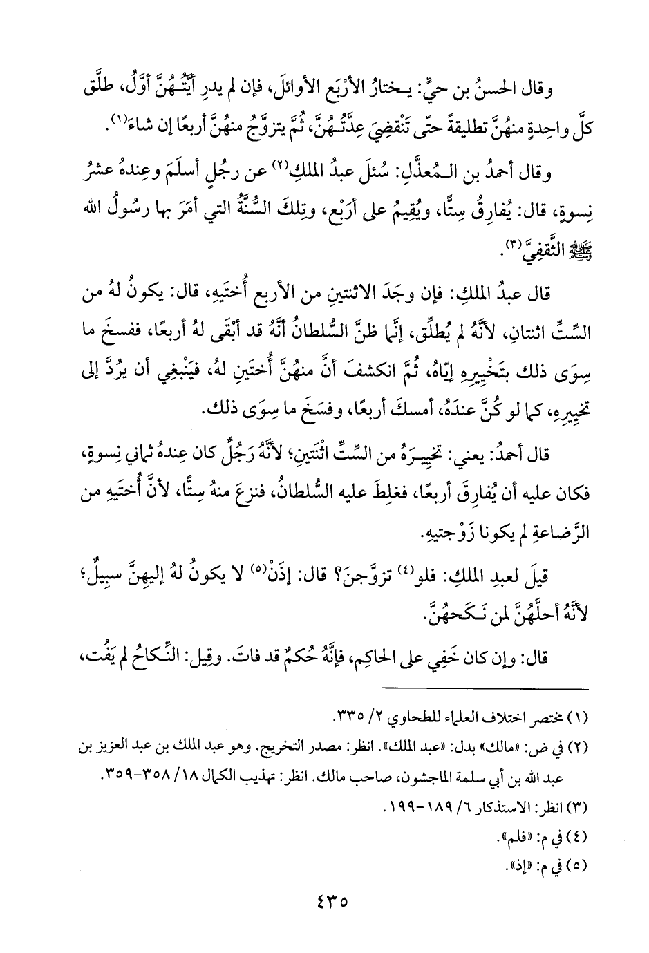 وقال أحمدُ بن المُعذَّلِ: سُئلَ عبدُ الملكِ (¬٢) عن رجُلٍ أسلَمَ وعِندهُ عشرُ نِسوةٍ، قال: يُفارِقُ سِتًّا، ويُقِيمُ على أرَبْع، وتِلكَ السُّنَّة التي أمَرَ بها رسُولُ الله - صلى الله عليه وسلم - الثَّقفِيَّ (¬٣).