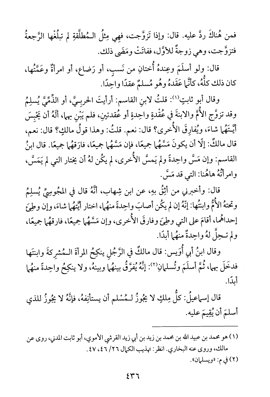 وقال ابنُ أبي أُوَيس: قال مالكٌ في الرَّجُلِ ينكِحُ المرأةَ المُشرِكةَ وابنتَها فدخَلَ بهما، ثُمَّ أسلَمَ وتُسلمانِ (¬٢): إنَّهُ يُفرَّقُ بينهُما وبينهُ، ولا ينكِحُ واحِدةً منهُما أبدًا.