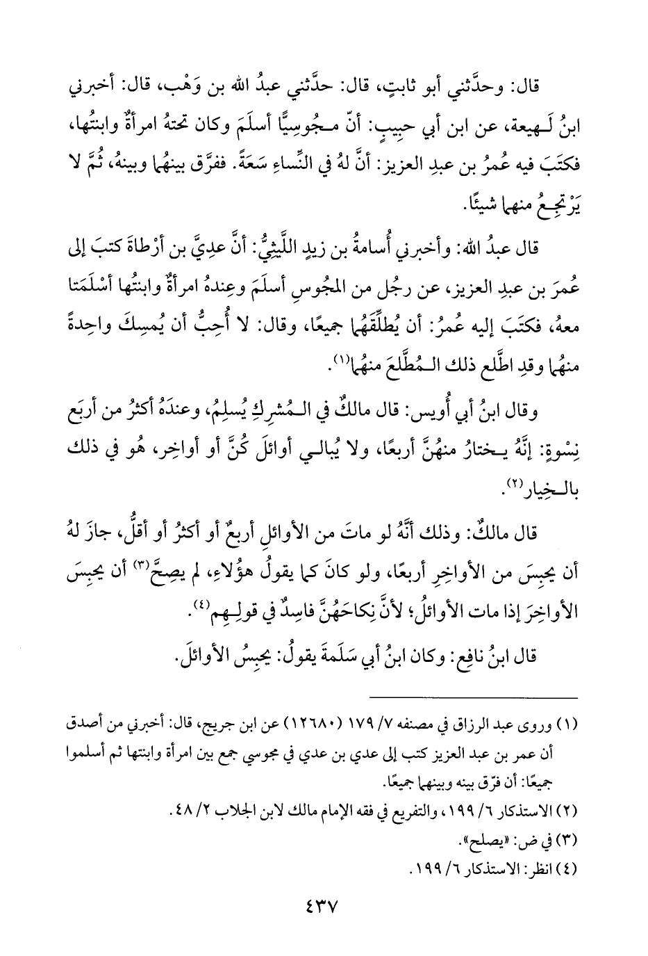 قال: وحدَّثني أبو ثابتٍ، قال: حدَّثني عبدُ الله بن وَهْب، قال: أخبرني ابنُ لَهيعة، عن ابن أبي حبِيبٍ: أنّ مجُوسِيًّا أسلَمَ وكان تحتهُ امرأةٌ وابنتُها، فكتَبَ فيه عُمرُ بن عبدِ العزيز: أنَّ لهُ في النِّساءِ سَعَةً. ففرَّق بينهُما وبينهُ، ثُمَّ لا يَرْتجِعُ منهما شيئًا.