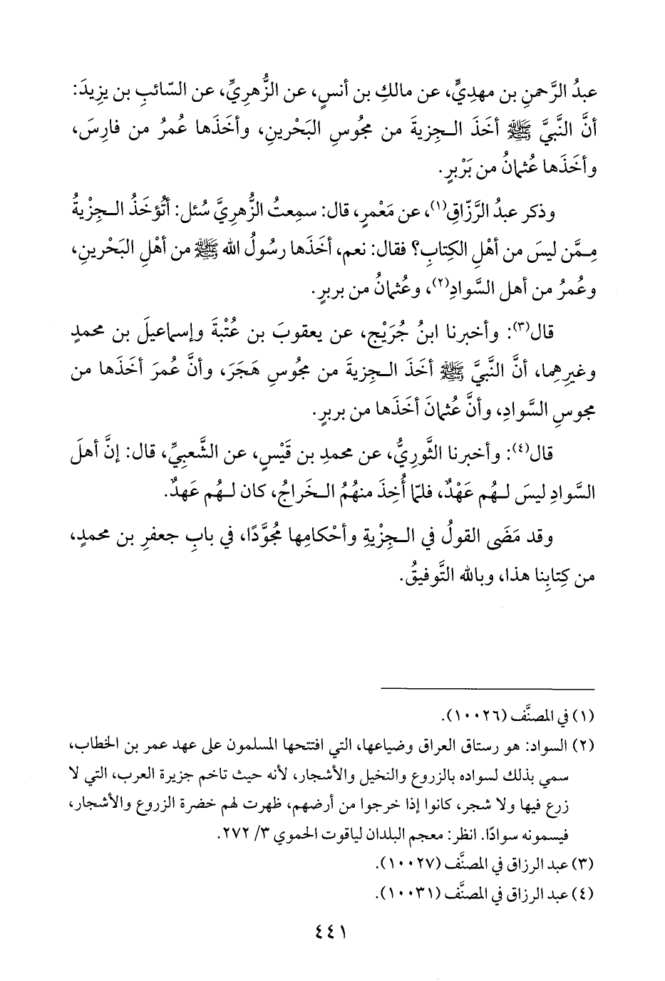 قال (¬٣): وأخبرنا ابنُ جُرَيْج، عن يعقوبَ بن عُتْبةَ وإسماعيلَ بن محمدٍ وغيرِهِما، أنَّ النَّبيَّ - صلى الله عليه وسلم - أخَذَ الجِزيةَ من مجُوسِ هَجَرَ، وأنَّ عُمرَ أخَذَها من مجوسِ السَّوادِ، وأنَّ عُثمانَ أخَذَها من بربرٍ.