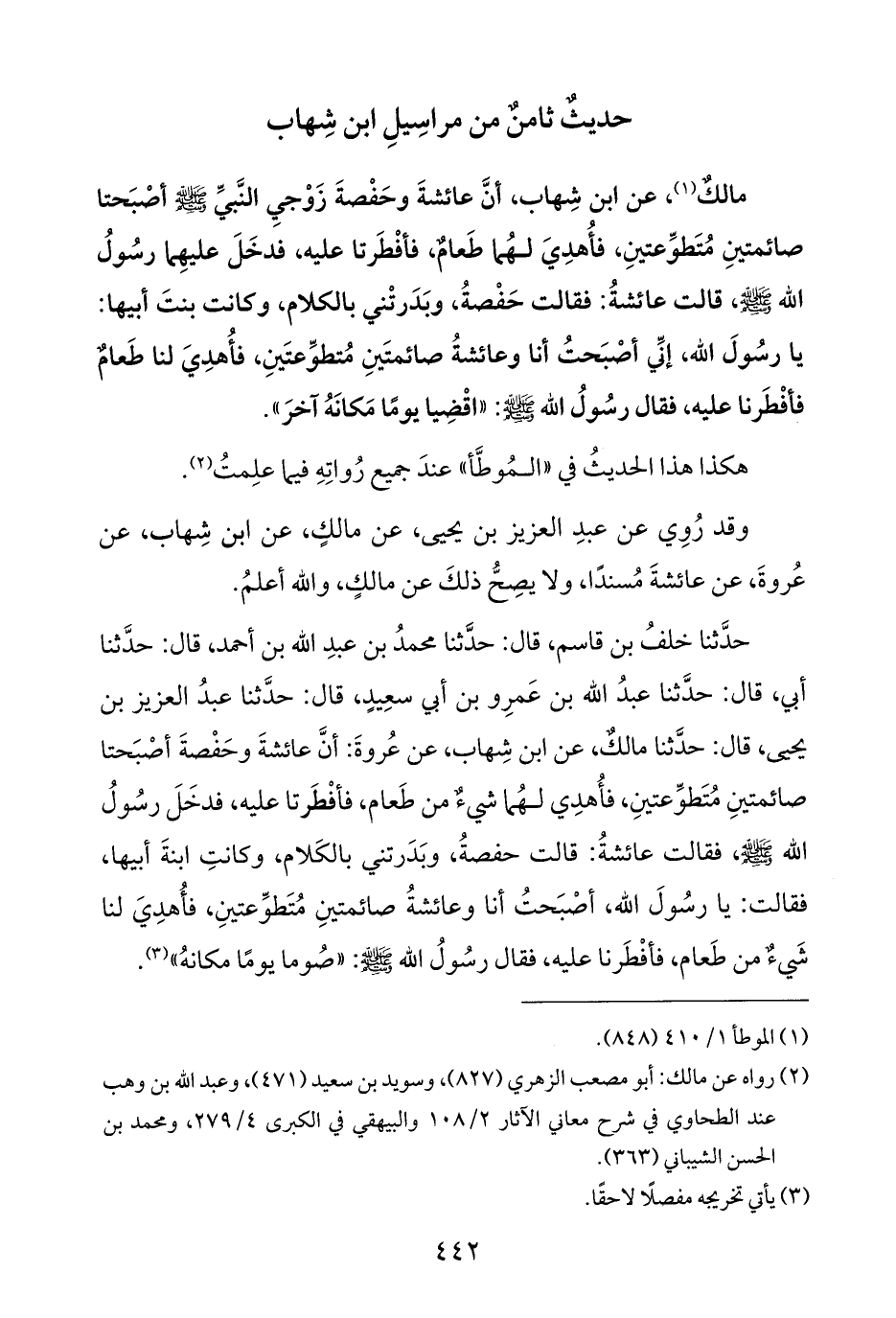 حدَّثنا خلفُ بن قاسم، قال: حدَّثنا محمدُ بن عبدِ الله بن أحمد، قال: حدَّثنا أبي، قال: حدَّثنا عبدُ الله بن عَمرِو بن أبي سعِيدٍ، قال: حدَّثنا عبدُ العزيز بن يحيى، قال: حدَّثنا مالكٌ، عن ابن شِهاب، عن عُروةَ: أنَّ عائشةَ وحَفْصةَ أصْبَحتا صائمتينِ مُتَطوِّعتينِ، فأُهدِي لهُما شيءٌ من طَعام، فأفْطَرتا عليه، فدخَلَ رسُولُ الله - صلى الله عليه وسلم -، فقالت عائشةُ: قالت حفصةُ، وبَدَرتني بالكَلام، وكانتِ ابنةَ أبيها، فقالت: يا رسُولَ الله، أصْبَحتُ أنا وعائشةُ صائمتينِ مُتَطوِّعتينِ، فأُهدِيَ لنا شَيءٌ من طَعام، فأفْطَرنا عليه، فقال رسُولُ الله - صلى الله عليه وسلم -: "صُوما يومًا مكانهُ" (¬٣).