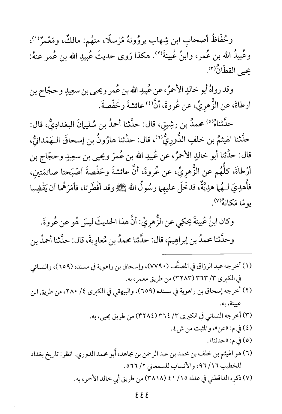 حدَّثناهُ (¬٥) محمدُ بن رشِيقٍ، قال: حدَّثنا أحمدُ بن سُليمانَ البغدادِيُّ، قال: حدَّثنا الهيثمُ بن خلفٍ الدُّورِيُّ (¬٦)، قال: حدَّثنا هارُونُ بن إسحاقَ الهَمْدانيُّ، قال: حدَّثنا أبو خالدٍ الأحمرُ، عن عُبيدِ الله بن عُمرَ ويحيى بن سعِيدٍ وحجّاج بن أرْطاةَ، كلُّهُم عن الزُّهرِيِّ، عن عُروةَ، أنَّ عائشةَ وحَفْصةَ أصْبَحتا صائمَتينِ، فأُهدِيَ لهُما هدِيَّةٌ، فدخَلَ عليهِما رسُولُ الله - صلى الله عليه وسلم - وقد أفْطَرتا، فأمَرَهُما أن يَقْضِيا يومًا مَكانهُ (¬٧).