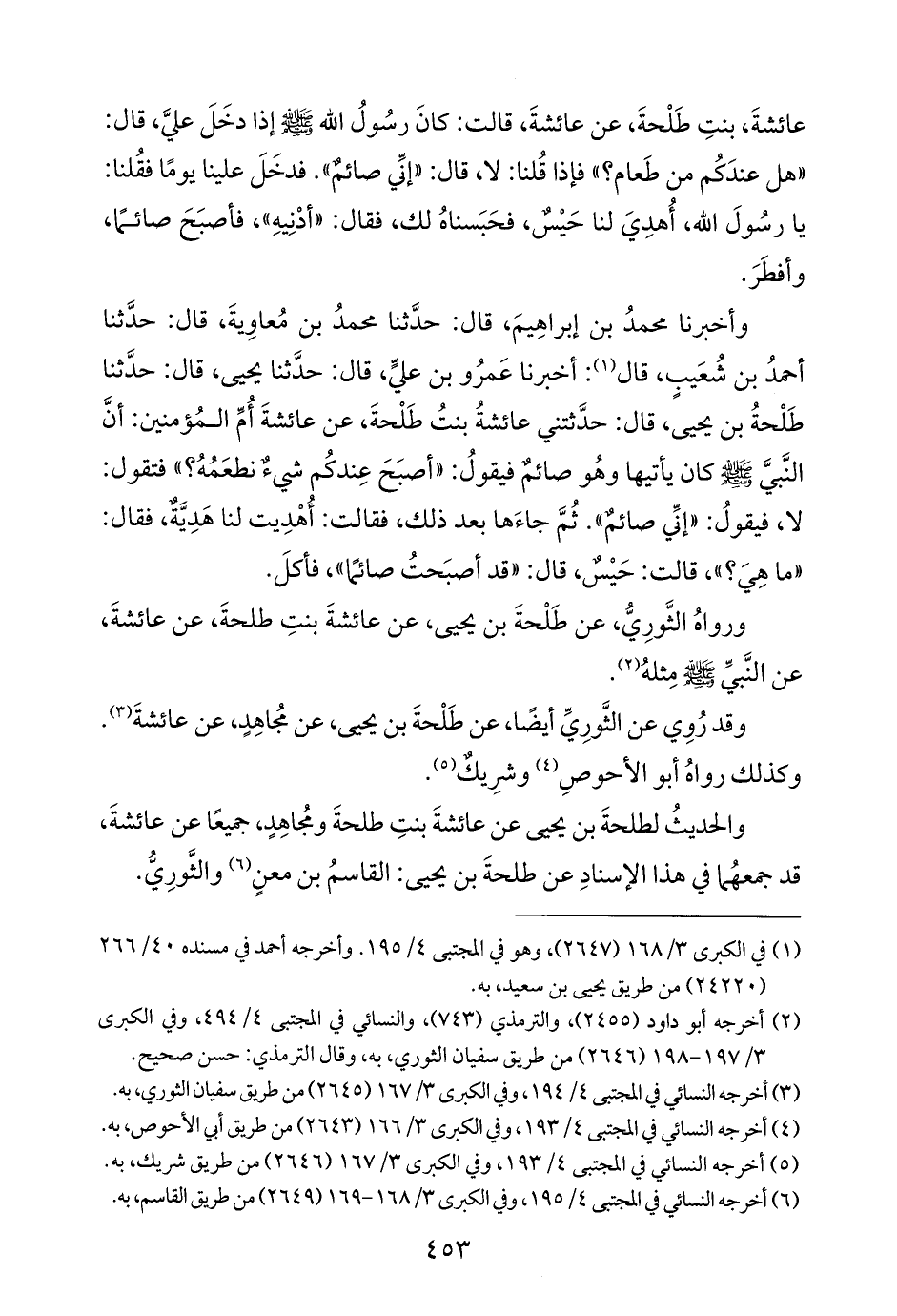 وأخبرنا محمدُ بن إبراهِيمَ، قال: حدَّثنا محمدُ بن مُعاوِيةَ، قال: حدَّثنا أحمدُ بن شُعَيبٍ، قال (¬١): أخبرنا عَمرُو بن عليٍّ، قال: حدَّثنا يحيى، قال: حدَّثنا طَلْحةُ بن يحيى، قال: حدَّثتني عائشةُ بنتُ طَلْحةَ، عن عائشةَ أُمِّ المُؤمنين: أنَّ النَّبيَّ - صلى الله عليه وسلم - كان يأتيها وهُو صائمٌ فيقولُ: "أصبَحَ عِندكُم شيءٌ نطعَمُهُ؟ " فتقول: لا، فيقولُ: "إنِّي صائمٌ". ثُمَّ جاءَها بعد ذلك، فقالت: أُهْدِيت لنا هَدِيَّةٌ، فقال: "ما هِيَ؟ "، قالت: حَيْسٌ، قال: "قد أصبَحتُ صائمًا"، فأكلَ.