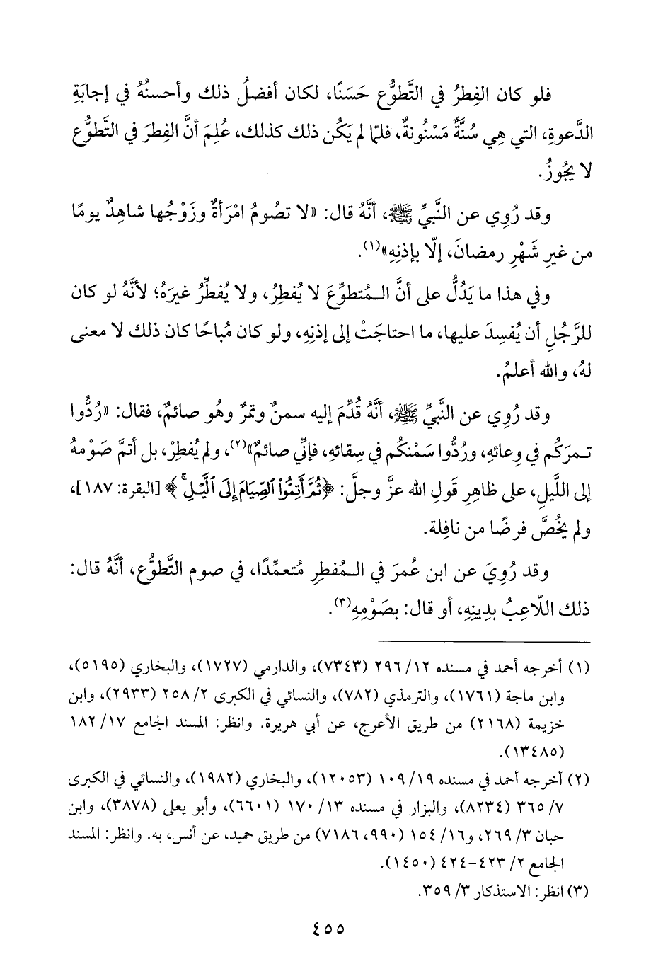 وقد رُوِي عن النَّبيِّ - صلى الله عليه وسلم -، أنَّهُ قُدِّمَ إليه سمنٌ وتمرٌ وهُو صائمٌ، فقال: "رُدُّوا تمرَكُم في وِعائهِ، ورُدُّوا سَمْنكُم في سِقائهِ، فإنِّي صائمٌ" (¬٢)، ولم يُفطِرْ، بل أتمَّ صَوْمهُ إلى اللَّيلِ، على ظاهِرِ قَولِ الله عزَّ وجلَّ: {ثُمَّ أَتِمُّوا الصِّيَامَ إِلَى اللَّيْلِ} [البقرة: ١٨٧]، ولم يخُصَّ فرضًا من نافِلة.