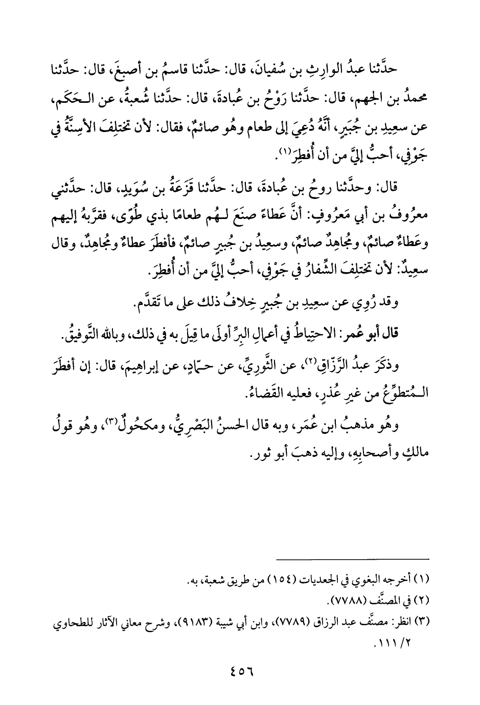 قال: وحدَّثنا روحُ بن عُبادةَ، قال: حدَّثنا قَزَعَةُ بن سُوَيدٍ، قال: حدَّثني معرُوفُ بن أبي مَعرُوفٍ: أنَّ عَطاءً صنَعَ لهُم طعامًا بذي طُوًى، فقرَّبهُ إليهم وعَطاءٌ صائمٌ، ومُجاهِدٌ صائمٌ، وسعِيدُ بن جُبيرٍ صائمٌ، فأفطَرَ عطاءٌ ومُجاهِدٌ، وقال سعِيدٌ: لأن تختلِفَ الشِّفارُ في جَوْفِي، أحبُّ إليَّ من أن أُفطِرَ.