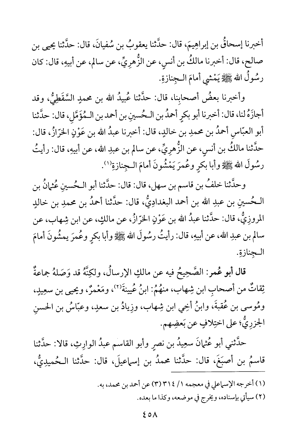 وأخبرنا بعضُ أصحابِنا، قال: حدَّثنا عُبيدُ الله بن محمدٍ السَّقَطِيُّ، وقد أجازَهُ لنا، قال: أخبرنا أبو بكرٍ أحمدُ بن الحُسينِ بن أحمد بن المُؤَمَّلِ، قال: حدَّثنا أبو العبّاسِ أحمدُ بن محمدِ بن خالدٍ، قال: أخبرنا عبدُ الله بن عَوْنٍ الخرّازُ، قال: حدَّثنا مالكُ بن أنسٍ، عن الزُّهرِيِّ، عن سالم بن عبدِ الله، عن أبيهِ، قال: رأيتُ رسُولَ الله وأبا بكرٍ وعُمرَ يَمْشُونَ أمامَ الجِنازةِ (¬١).