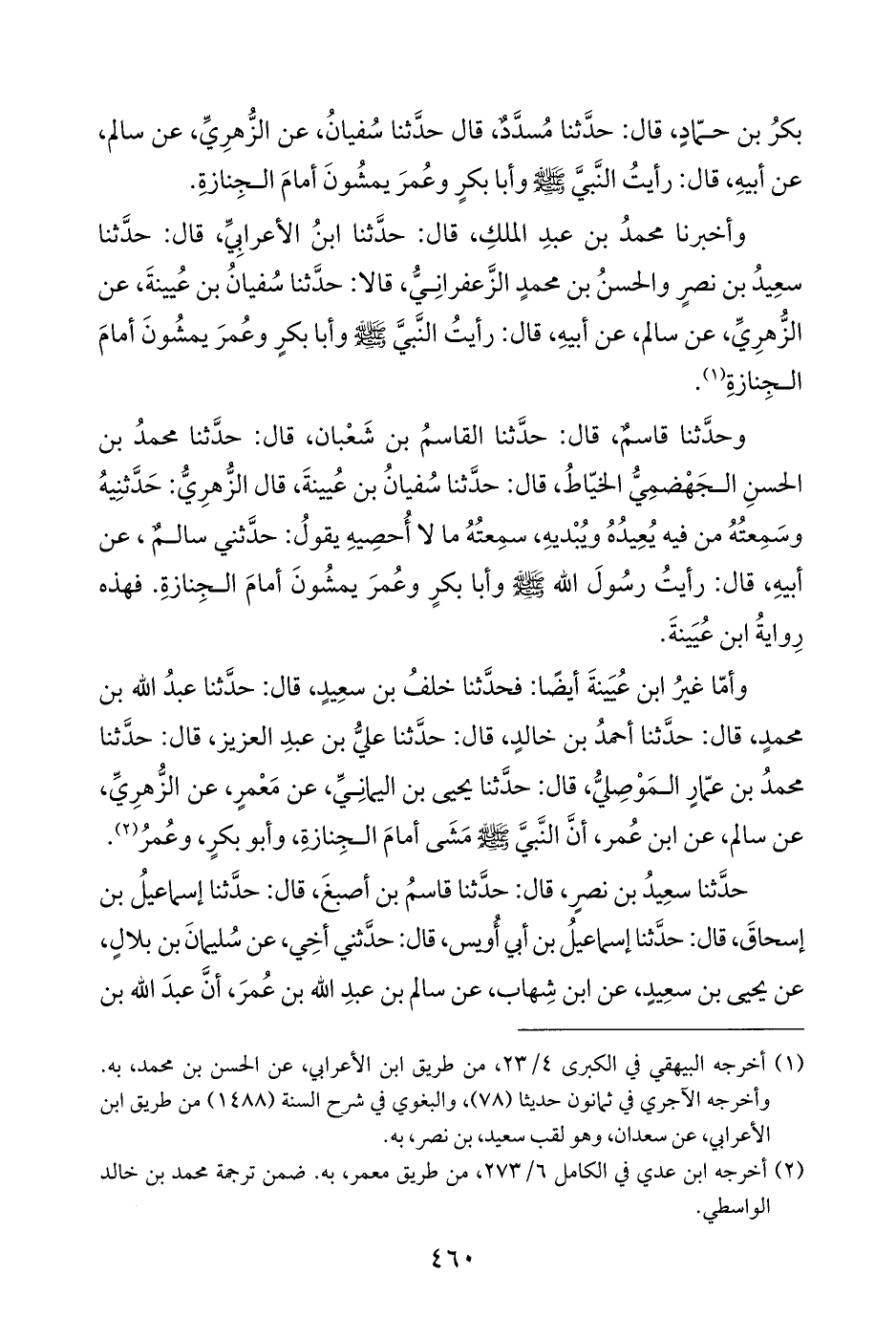 وحدَّثنا قاسمٌ، قال: حدَّثنا القاسمُ بن شَعْبان، قال: حدَّثنا محمدُ بن الحسنِ الجَهْضمِيُّ الخيّاطُ، قال: حدَّثنا سُفيانُ بن عُيينةَ، قال الزُّهرِيُّ: حَدَّثنِيهُ وسَمِعتُهُ من فيه يُعِيدُهُ ويُبْديهِ، سمِعتُهُ ما لا أُحصيهِ يقولُ: حدَّثني سالمٌ، عن أبيهِ، قال: رأيتُ رسُولَ الله - صلى الله عليه وسلم - وأبا بكرٍ وعُمرَ يمشُونَ أمامَ الجِنازةِ. فهذه رِوايةُ ابن عُيَينةَ.