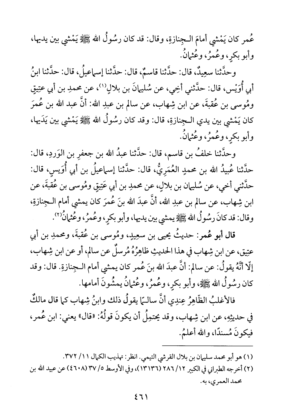 قال أبو عُمر: حديثُ يحيى بن سعِيدٍ، ومُوسى بن عُقبةَ، ومحمدِ بن أبي عتِيق، عن ابن شِهاب في هذا الحديثِ ظاهِرُهُ مُرسلٌ عن سالم، أو عن ابن شِهاب، إلّا أنَّهُ يقولُ: عن سالم: أنَّ عبدَ الله بنَ عُمر كان يمشي أمام الجِنارةِ. قال: وقد كان رسُولُ الله - صلى الله عليه وسلم -، وأبو بكرٍ، وعُمرُ، وعُثمانُ يمشُونَ أمامها.