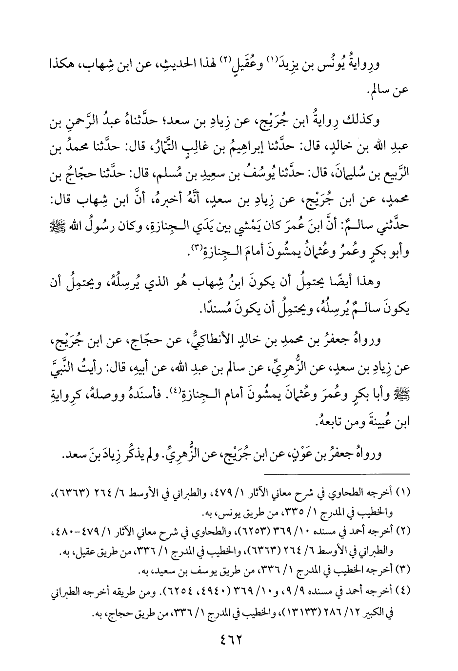 وكذلك رِوايةُ ابن جُرَيْج، عن زِيادِ بن سعد؛ حدَّثناهُ عبدُ الرَّحمنِ بن عبدِ الله بن خالدٍ، قال: حدثنا إبراهِيمُ بن غالِبٍ التمارُ، قال: حدَّثنا محمدُ بن الرَّبيع بن سُليمانَ، قال: حدَّثنا يُوسُفُ بن سعِيدِ بن مُسلم، قال: حدَّثنا حجّاجُ بن محمدٍ، عن ابن جُرَيْج، عن زِيادِ بن سعدٍ، أنَّهُ أخبرهُ، أنَّ ابن شِهاب قال: حدَّثني سالمٌ: أنَّ ابنَ عُمرَ كان يَمْشي بين يَدَي الجِنارةِ، وكان رسُولُ الله - صلى الله عليه وسلم - وأبو بكرٍ وعُمرُ وعُثمانُ يمشُونَ أمامَ الجِنازةِ (¬٣).