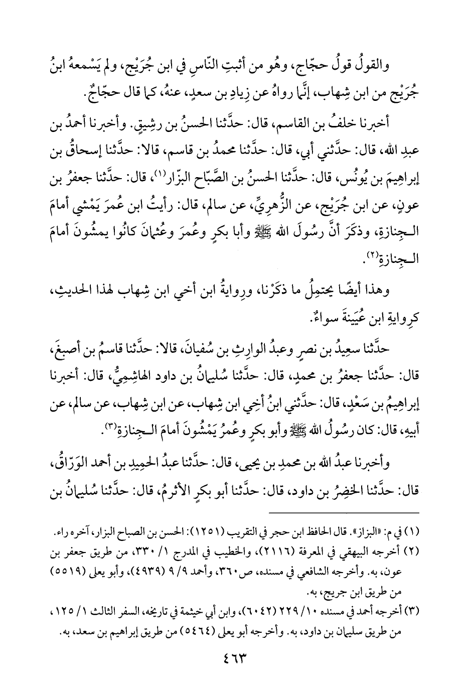 حدَّثنا سعِيدُ بن نصرٍ وعبدُ الوارِثِ بن سُفيانَ، قالا: حدَّثنا قاسمُ بن أصبغَ، قال: حدَّثنا جعفرُ بن محمدٍ، قال: حدَّثنا سُليمانُ بن داود الهاشِمِيُّ، قال: أخبرنا إبراهِيمُ بن سَعْدٍ، قال: حدَّثني ابنُ أخِي ابن شِهاب، عن ابن شِهاب، عن سالم، عن أبيهِ، قال: كان رسُولُ الله - صلى الله عليه وسلم - وأبو بكرٍ وعُمرُ يَمْشُونَ أمامَ الجِنازةِ (¬٣).