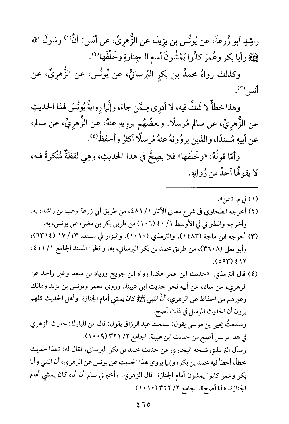(¬٤) قال الترمذي: "حديث ابن عمر هكذا رواه ابن جريج وزياد بن سعد وغير واحد عن الزهري، عن سالم، عن أبيه نحو حديث ابن عيينة. وروى معمر ويونس بن يزيد ومالك وغيرهم من الحفاظ عن الزهري، أنَّ النبي - صلى الله عليه وسلم - كان يمشي أمام الجنازة. وأهل الحديث كلهم يرون أن الحديث المرسل في ذلك أصح.