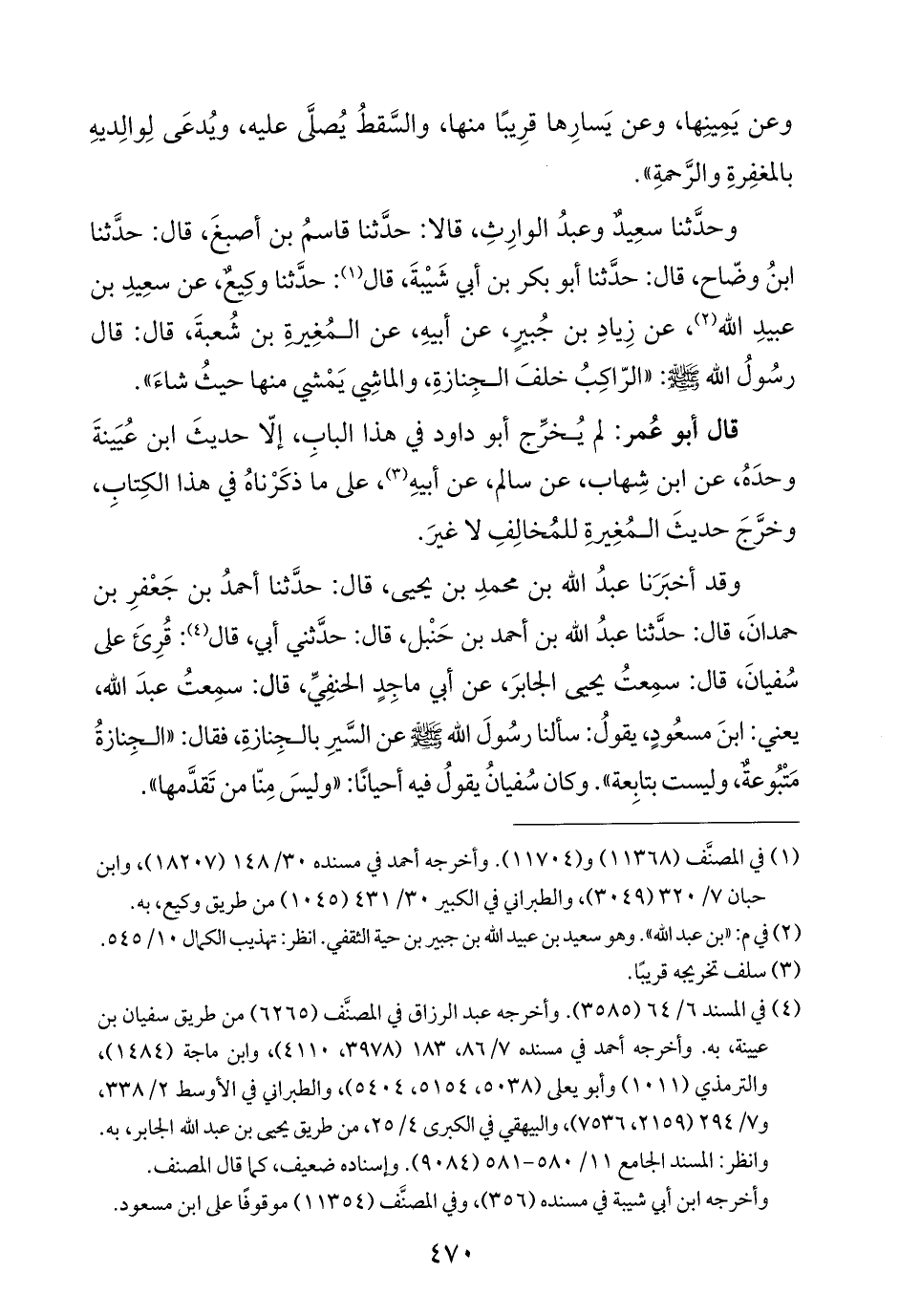 وقد أخبَرَنا عبدُ الله بن محمدِ بن يحيى، قال: حدَّثنا أحمدُ بن جَعْفرِ بن حمدانَ، قال: حدَّثنا عبدُ الله بن أحمد بن حَنْبل، قال: حدَّثني أبي، قال (¬٤): قُرِئَ على سُفيانَ، قال: سمِعتُ يحيى الجابرَ، عن أبي ماجِدٍ الحنفِيِّ، قال: سمِعتُ عبدَ الله، يعني: ابنَ مسعُودٍ، يقولُ: سألنا رسُولَ الله - صلى الله عليه وسلم - عن السَّيرِ بالجِنازةِ، فقال: "الجِنازةُ مَتْبُوعةٌ، وليست بتابِعة". وكان سُفيانُ يقولُ فيه أحيانًا: "وليسَ مِنّا من تَقدَّمها".