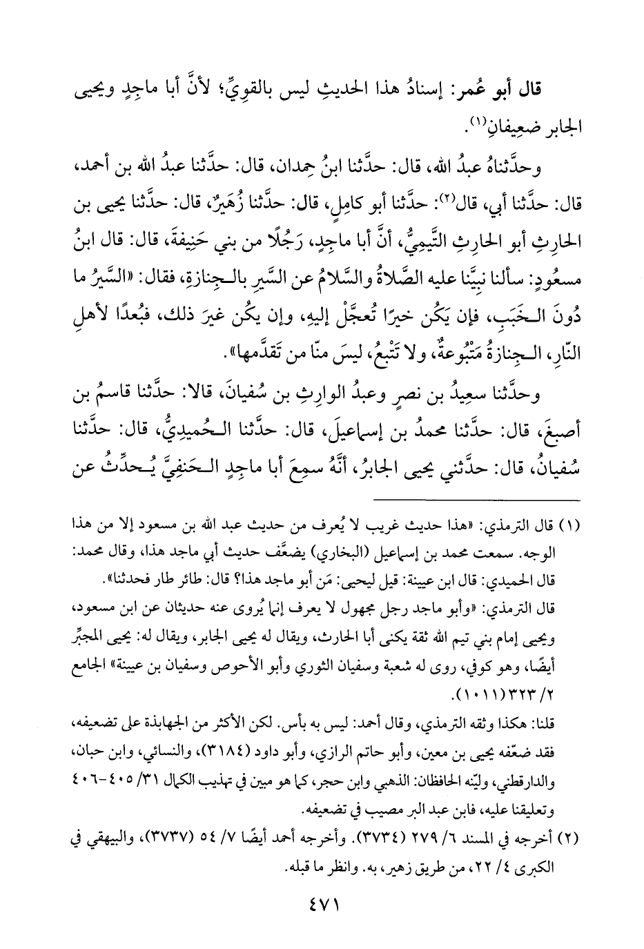 وحدَّثناهُ عبدُ الله، قال: حدَّثنا ابنُ حِمدان، قال: حدَّثنا عبدُ الله بن أحمد، قال: حدَّثنا أبي، قال (¬٢): حدَّثنا أبو كامِلٍ، قال: حدَّثنا زُهَيرٌ، قال: حدَّثنا يحيى بن الحارِثِ أبو الحارِثِ التَّيمِيُّ، أنَّ أبا ماجِدٍ، رَجُلًا من بني حَنِيفةَ، قال: قال ابنُ مسعُودٍ: سألنا نبِيَّنا عليه الصَّلاةُ والسَّلامُ عن السَّيرِ بالجِنازةِ، فقال: "السَّيرُ ما دُونَ الخَبَبِ، فإن يَكُن خيرًا تُعجَّلْ إليهِ، وإن يكُن غيرَ ذلك، فبُعدًا لأهلِ النّارِ، الجِنازةُ مَتْبُوعةٌ، ولا تَتْبعُ، ليسَ منّا من تَقدَّمها".
