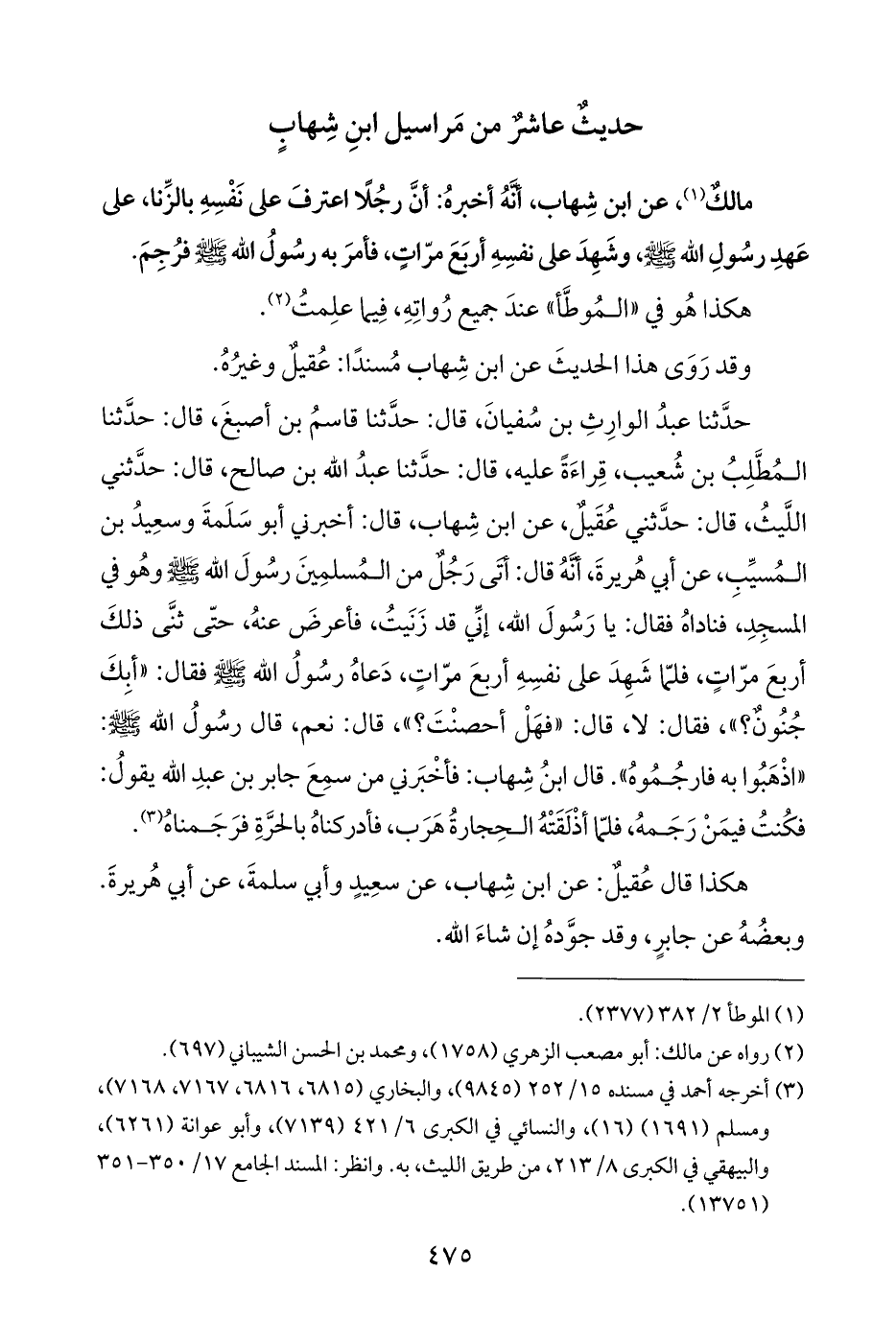 مالك (¬١)، عن ابن شِهاب، أنهُ أخبره: أنَّ رجُلًا اعترفَ على نَفْسِهِ بالزِّنا، على عَهدِ رسُولِ الله - صلى الله عليه وسلم -، وشَهِدَ على نفسِهِ أربَعَ مرّاتٍ، فأمرَ به رسُولُ الله - صلى الله عليه وسلم - فرُجِمَ.