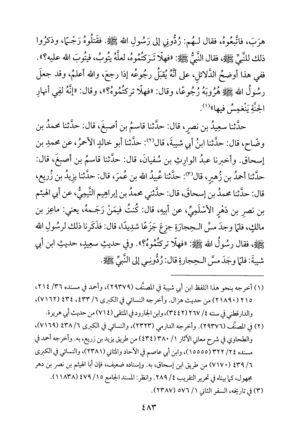 حدَّثنا سعِيدُ بن نصرٍ، قال: حدَّثنا قاسمُ بن أصبغَ، قال: حدَّثنا محمدُ بن وضّاح، قال: حدَّثنا ابنُ أبي شيبةَ، قال (¬٢): حدَّثنا أبو خالدٍ الأحمرُ، عن محمدِ بن إسحاق. وأخبرنا عبدُ الوارِثِ بن سُفيانَ، قال: حدَّثنا قاسمُ بن أصبغَ، قال: حدَّثنا أحمدُ بن زُهيرٍ، قال (¬٣): حدَّثنا عُبيدُ الله بن عُمرَ، قال: حدَّثنا يزِيدُ بن زُريع، قال: حدَّثنا محمدُ بن إسحاقَ، قال: حدَّثني محمدُ بن إبراهِيم التَّيمِيُّ، عن أبي الهيثم بن نصرِ بن دَهْرٍ الأسْلَمِيِّ، عن أبيهِ، قال: كُنتُ فيمَنْ رَجَمهُ، يعني: ماعِز بن مالكٍ، فلمَّا وجدَ مسَّ الحِجارة جزع جَزَعًا شدِيدًا، قال: فذَكَرنا ذلك لرسُولِ الله - صلى الله عليه وسلم -، فقال رسُولُ الله - صلى الله عليه وسلم -: "فهلّا تركتُمُوهُ؟ ". وفي حديثِ سعِيدٍ، حديثِ ابن أبي شيبةَ: فلمَّا وجَدَ مسَّ الحِجارة قال: رُدُّوني إلى النَّبيِّ - صلى الله عليه وسلم -.