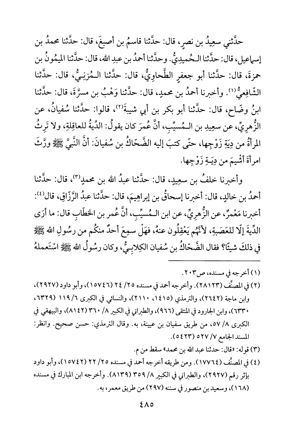 حدَّثني سعِيدُ بن نصرٍ، قال: حدَّثنا قاسمُ بن أصبغَ، قال: حدَّثنا محمدُ بن إسماعيل، قال: حدَّثنا الحُميدِيُّ. وحدَّثنا أحمدُ بن عبدِ الله، قال: حدَّثنا الميمُونُ بن حمزةَ، قال: حدَّثنا أبو جعفرٍ الطَّحاوِيُّ، قال: حدَّثنا المُزنِيُّ، قال: حدَّثنا الشّافِعيُّ (¬١). وأخبرنا أحمدُ بن محمدٍ، قال: حدَّثنا وَهْبُ بن مسرَّةَ، قال: حدَّثنا ابنُ وضّاح، قال: حدَّثنا أبو بكر بن أبي شيبةَ (¬٢)، قالوا: حدَّثنا سُفيانُ، عن الزُّهرِيِّ، عن سعِيدِ بن المُسيِّبِ، أنَّ عُمرَ كان يقولُ: الدِّيةُ للعاقِلةِ، ولا تَرِثُ المرأةُ من دِيَةِ زَوْجِها، حتّى كتبَ إليه الضَّحَّاكُ بن سُفيانَ: أنَّ النَّبيَّ - صلى الله عليه وسلم - ورَّثَ امرأةً أشْيمَ من دِيَةِ زَوْجِها.