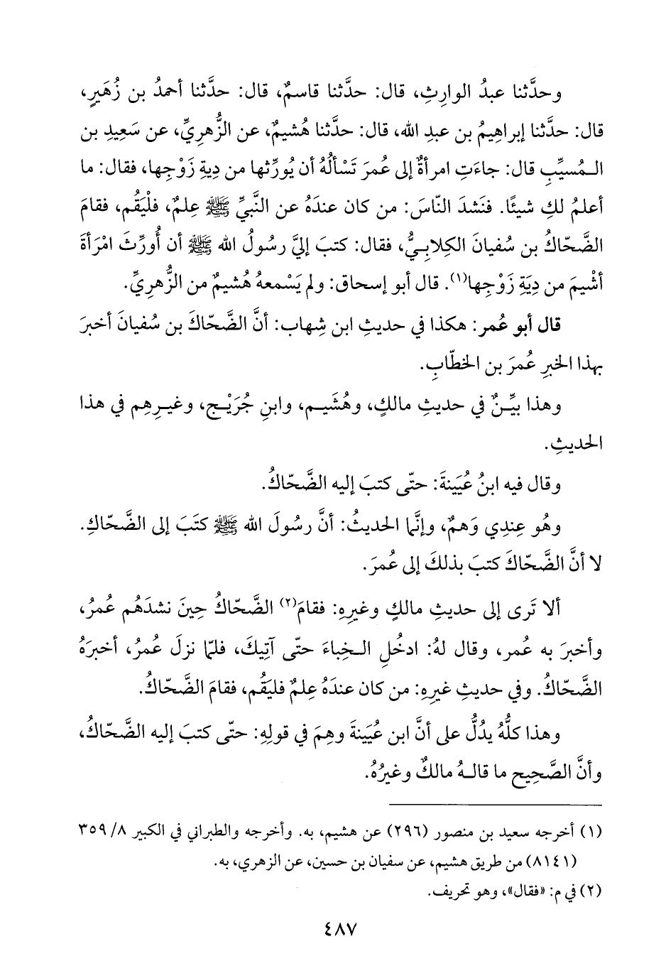 وحدَّثنا عبدُ الوارِثِ، قال: حدَّثنا قاسمٌ، قال: حدَّثنا أحمدُ بن زُهَير، قال: حدَّثنا إبراهِيمُ بن عبدِ الله، قال: حدَّثنا هُشيم، عن الزُّهرِيِّ، عن سَعِيدِ بن المُسيِّبِ قال: جاءَتِ امرأةٌ إلى عُمرَ تَسْألُهُ أن يُورِّثها من دِيةِ زَوْجِها، فقال: ما أعلمُ لكِ شيئًا. فنَشدَ النّاسَ: من كان عندَهُ عن النَّبيِّ - صلى الله عليه وسلم - عِلم، فلْيَقُم، فقامَ الضَّحَّاكُ بن سُفيانَ الكِلابِيُّ، فقال: كتبَ إليَّ رسُولُ الله - صلى الله عليه وسلم - أن أُورِّثَ امْرَأةَ أشْيمَ من دِيَةِ زَوْجِها (¬١). قال أبو إسحاق: ولم يَسْمعهُ هُشيم من الزُّهرِيِّ.