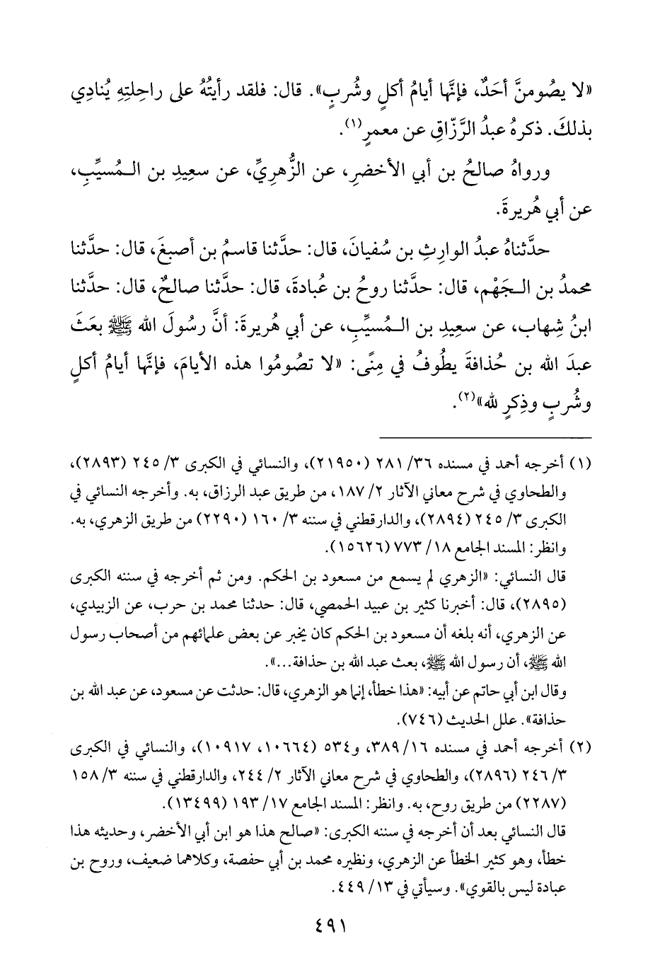 حدَّثناهُ عبدُ الوارِثِ بن سُفيانَ، قال: حدَّثنا قاسمُ بن أصبغَ، قال: حدَّثنا محمدُ بن الجَهْم، قال: حدَّثنا روحُ بن عُبادةَ، قال: حدَّثنا صالح، قال: حدَّثنا ابنُ شِهاب، عن سعِيدِ بن المُسيِّبِ، عن أبي هُريرةَ: أنَّ رسُولَ الله - صلى الله عليه وسلم - بعَثَ عبدَ الله بن حُذافةَ يطُوفُ في مِنًى: "لا تصُومُوا هذه الأيامَ، فإنَّها أيامُ أكلٍ وشُربٍ وذِكرٍ لله" (¬٢).