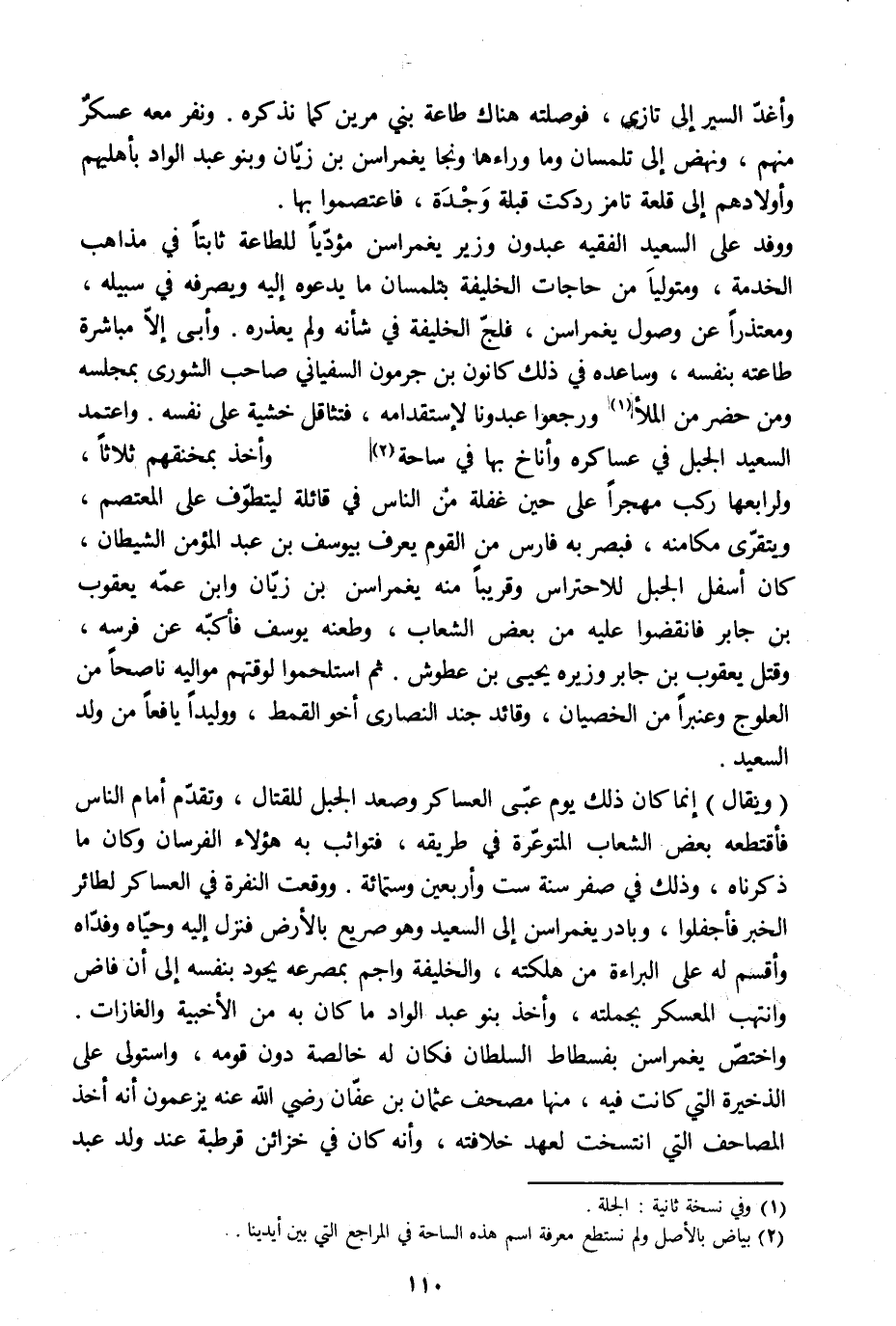 (ويقال) إنما كان ذلك يوم عبّى العساكر وصعد الجبل للقتال، وتقدّم أمام الناس فاقتطعه بعض الشعاب المتوعّرة في طريقه، فتواثب به هؤلاء الفرسان وكان ما ذكرناه، وذلك في صفر سنة ست وأربعين وستمائة. ووقعت النفرة في العساكر لطائر الخبر فأجفلوا، وبادر يغمراسن إلى السعيد وهو صريع بالأرض فنزل إليه وحيّاه وفدّاه وأقسم له على البراءة من هلكته، والخليفة وأجم بمصرعه يجود بنفسه إلى أن فاض وانتهب المعسكر بجملته، وأخذ بنو عبد الواد ما كان به من الأخبية والغازات.
