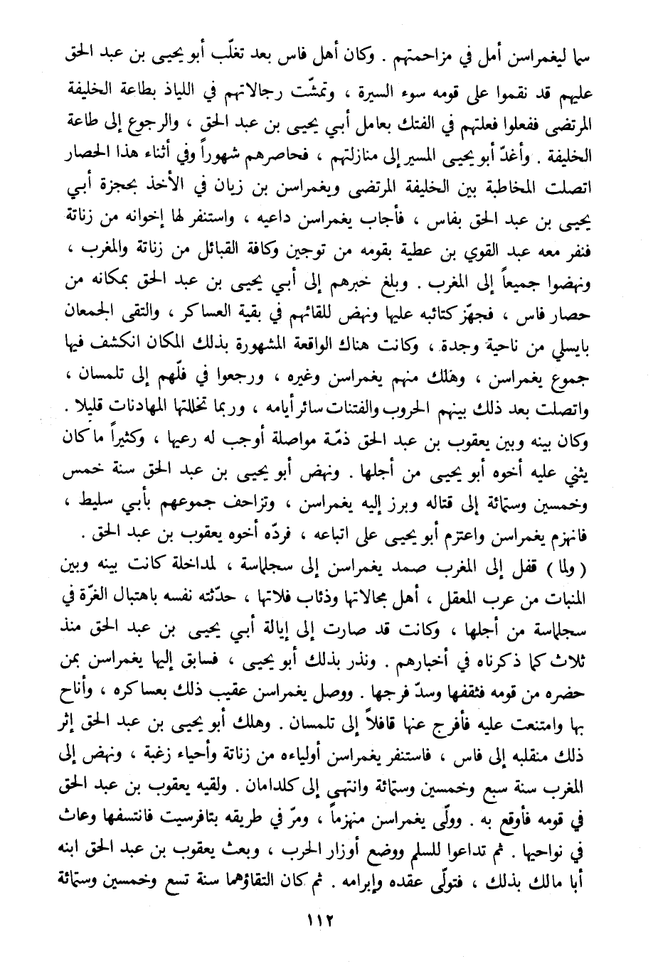 (ولما) قفل إلى المغرب صمد يغمراسن إلى سجلماسة، لمداخلة كانت بينه وبين المنبات من عرب المعقل، أهل مجالاتها وذئاب فلاتها، حدّثته نفسه باهتبال الغرّة في سجلماسة من أجلها، وكانت قد صارت إلى إيالة أبي يحيى بن عبد الحق منذ ثلاث كما ذكرناه في أخبارهم. ونذر بذلك أبو يحيى، فسابق إليها يغمراسن بمن حضره من قومه فثقفها وسدّ فرجها. ووصل يغمراسن عقيب ذلك بعساكره، وأناح بها وامتنعت عليه فأفرج عنها قافلا إلى تلمسان. وهلك أبو يحيى بن عبد الحق إثر ذلك منقلبه إلى فاس، فاستنفر يغمراسن أولياءه من زناتة وأحياء زغبة، ونهض إلى المغرب سنة سبع وخمسين وستمائة وانتهى إلى كلدامان. ولقيه يعقوب بن عبد الحق في قومه فأوقع به. وولّى يغمراسن منهزما، ومرّ في طريقه بتافرسيت فانتسفها وعاث في نواحيها. ثم تداعوا للسلم ووضع أوزار الحرب، وبعث يعقوب بن عبد الحق ابنه أبا مالك بذلك، فتولّى عقده وإبرامه. ثم كان التقاؤهما سنة تسع وخمسين وستمائة