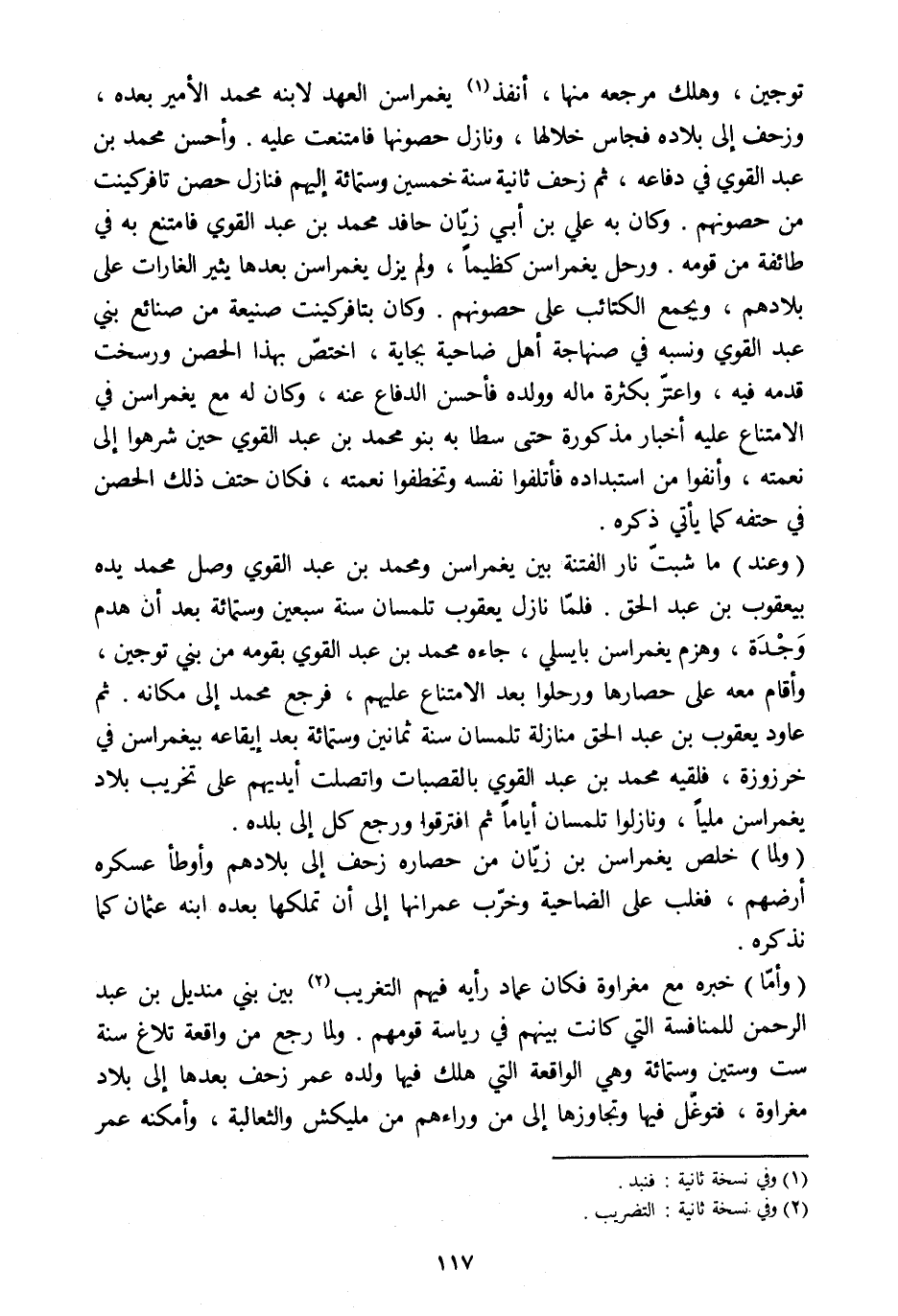 توجين، وهلك مرجعه منها، أنفذ [1] يغمراسن العهد لابنه محمد الأمير بعده، وزحف إلى بلاده فجاس خلالها، ونازل حصونها فامتنعت عليه. وأحسن محمد بن عبد القوي في دفاعه، ثم زحف ثانية سنة خمسين وستمائة إليهم فنازل حصن تافركينت من حصونهم. وكان به علي بن أبي زيّان حافد محمد بن عبد القوي فامتنع به في طائفة من قومه. ورحل يغمراسن كظيما، ولم يزل يغمراسن بعدها يثير الغارات على بلادهم، ويجمع الكتائب على حصونهم. وكان بتافركينت صنيعة من صنائع بني عبد القوي ونسبه في صنهاجة أهل ضاحية بجاية، اختصّ بهذا الحصن ورسخت قدمه فيه، واعتزّ بكثرة ماله وولده فأحسن الدفاع عنه، وكان له مع يغمراسن في الامتناع عليه أخبار مذكورة حتى سطا به بنو محمد بن عبد القوي حين شرهوا إلى نعمته، وأنفوا من استبداده فأتلفوا نفسه وتخطفوا نعمته، فكان حتف ذلك الحصن في حتفه كما يأتي ذكره.