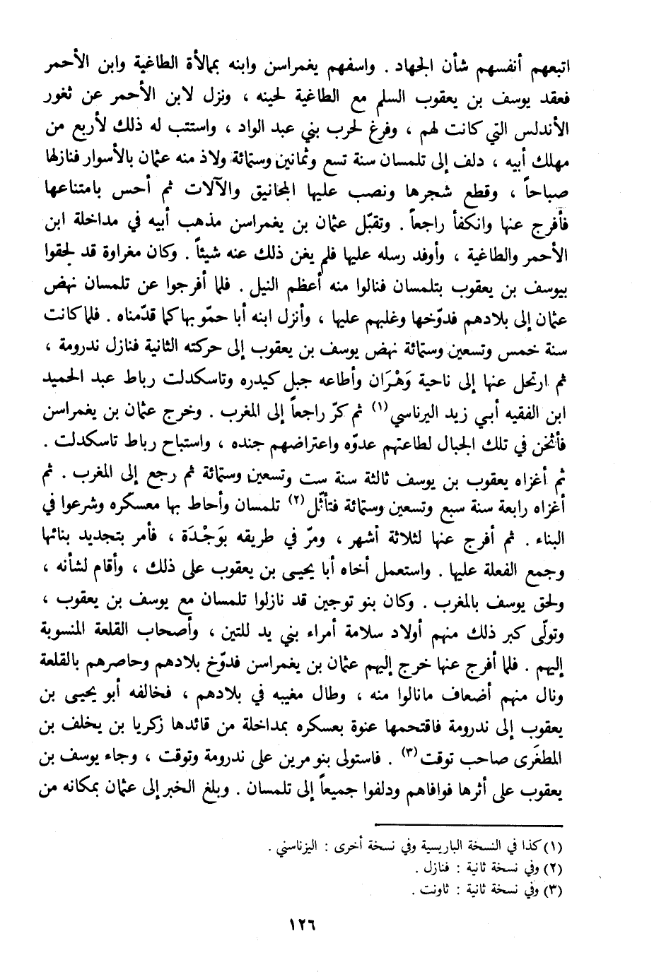 اتبعهم أنفسهم شأن الجهاد. واسفهم يغمراسن وابنه بممالأة الطاغية وابن الأحمر فعقد يوسف بن يعقوب السلم مع الطاغية لحينه، ونزل لابن الأحمر عن ثغور الأندلس التي كانت لهم، وفرغ لحرب بني عبد الواد، واستتب له ذلك لأربع من مهلك أبيه، دلف إلى تلمسان سنة تسع وثمانين وستمائة ولاذ منه عثمان بالأسوار فنازلها صباحا، وقطع شجرها ونصب عليها المجانيق والآلات ثم أحس بامتناعها فأفرج عنها وانكفأ راجعا. وتقبّل عثمان بن يغمراسن مذهب أبيه في مداخلة ابن الأحمر والطاغية، وأوفد رسله عليها فلم يغن ذلك عنه شيئا. وكان مغراوة قد لحقوا بيوسف بن يعقوب بتلمسان فنالوا منه أعظم النيل. فلما أفرجوا عن تلمسان نهض عثمان إلى بلادهم فدوّخها وغلبهم عليها، وأنزل ابنه أبا حمّو بها كما قدّمناه. فلما كانت سنة خمس وتسعين وستمائة نهض يوسف بن يعقوب إلى حركته الثانية فنازل ندرومة، ثم ارتحل عنها إلى ناحية وهران وأطاعه جبل كيدره وتاسكدلت رباط عبد الحميد ابن الفقيه أبي زيد اليرناسي [1] ثم كرّ راجعا إلى المغرب. وخرج عثمان بن يغمراسن فأثخن في تلك الجبال لطاعتهم عدوّه واعتراضهم جنده، واستباح رباط تاسكدلت.