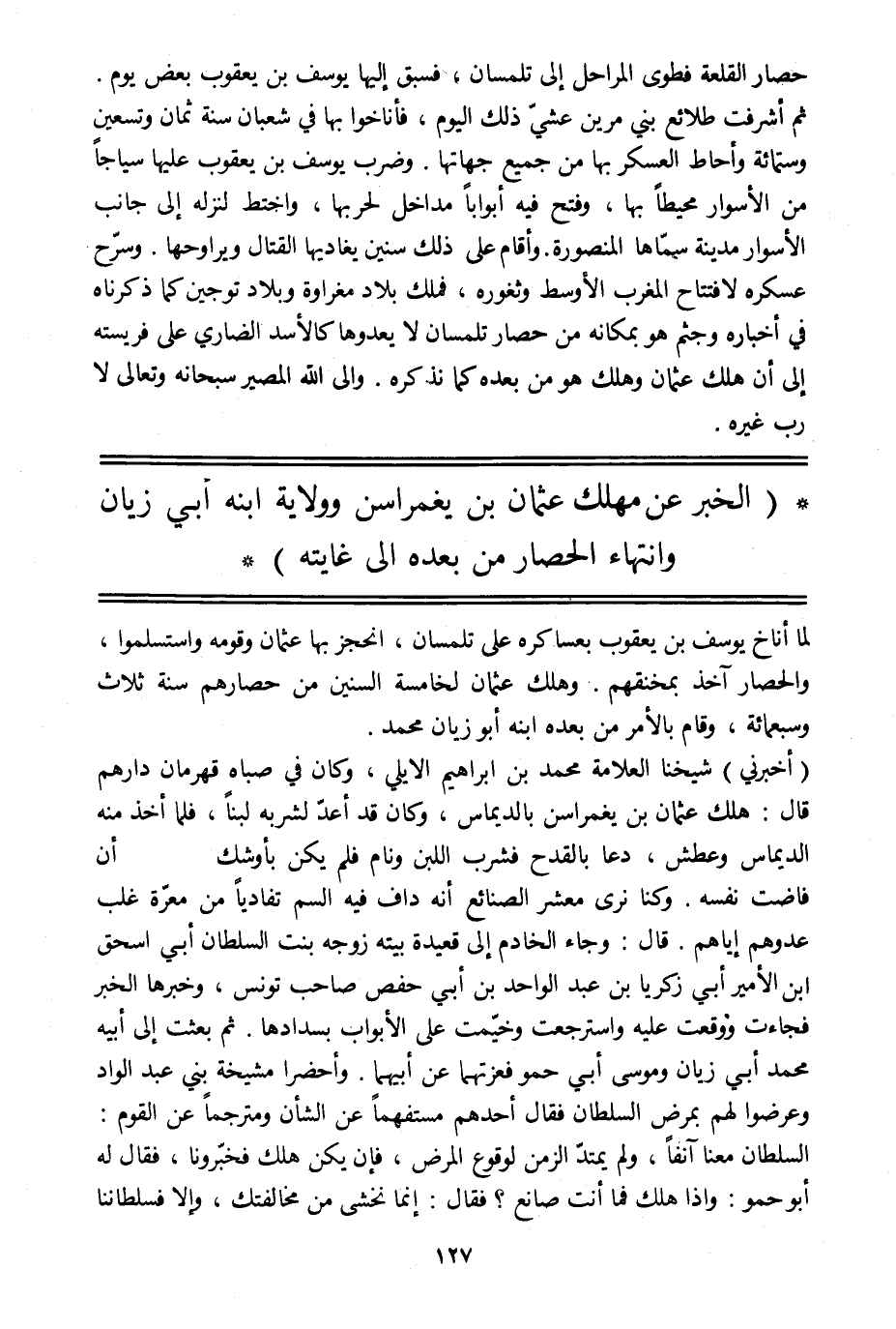 (أخبرني) شيخنا العلامة محمد بن إبراهيم الايلي، وكان في صباه قهرمان دارهم قال: هلك عثمان بن يغمراسن بالديماس، وكان قد أعدّ لشربه لبنا، فلما أخذ منه الديماس وعطش، دعا بالقدح فشرب اللبن ونام فلم يكن بأوشك أن فاضت نفسه. وكنا نرى معشر الصنائع أنه داف فيه السم تفاديا من معرّة غلب عدوهم إياهم. قال: وجاء الخادم إلى قعيدة بيته زوجه بنت السلطان أبي إسحاق ابن الأمير أبي زكريا بن عبد الواحد بن أبي حفص صاحب تونس، وخبرها الخبر فجاءت ووقعت عليه واسترجعت وخيّمت على الأبواب بسدادها. ثم بعثت إلى أبيه محمد أبي زيان وموسى أبي حمو فعزتهما عن أبيهما. وأحضرا مشيخة بني عبد الواد وعرضوا لهم بمرض السلطان فقال أحدهم مستفهما عن الشأن ومترجما عن القوم:
