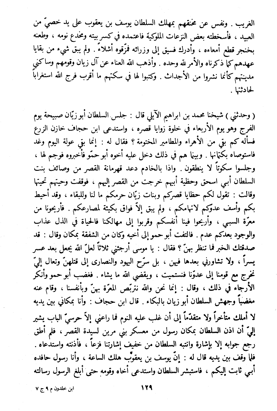 (وحدثني) شيخنا محمد بن إبراهيم الآيلي قال: جلس السلطان أبو زيّان صبيحة يوم الفرج وهو يوم الأربعاء في خلوة زوايا قصره، واستدعى ابن حجاف خازن الزرع فسأله كم بقي من الأهراء والمطامير المختومة؟ فقال له: إنما بقي عولة اليوم وغد فاستوصاه بكتمانها. وبينما هم في ذلك دخل عليه أخوه أبو حمّو فأخبروه فوجم لها، وجلسوا سكوتا لا ينطقون. وإذا بالخادم دعد قهرمانة القصر من وصائف بنت السلطان أبي إسحاق وحظية أبيهم خرجت من القصر إليهم، فوقفت وحيتهم تحيتها وقالت: تقول لكم حظايا قصركم وبنات زيّان حرمكم ما لنا وللبقاء، وقد أحيط بكم وأسف عدوّكم لاتهامكم، ولم يبق إلّا فواق بكيئة لمصارعكم. فأريحونا من معرّة السبي، وأريحوا فينا أنفسكم وقربوا إلى مهالكنا فالحياة في الذل عذاب والوجود بعدكم عدم. فالتفت أبو حمو إلى أخيه وكان من الشفقة بمكان وقال: قد صدقتك الخبر فما تنظر بهنّ؟ فقال: يا موسى أرجئني ثلاثا لعلّ الله يجعل بعد عسر يسرا، ولا تشاورني بعدها فيهن، بل سرّح اليهود والنصارى إلى قتلهنّ وتعال إليّ نخرج مع قومنا إلى عدوّنا فنستميت، ويقضي الله ما يشاء. فغضب أبو حمو وأنكر الأرجاء في ذلك، وقال: إنما نحن والله نتربّص المعرّة بهنّ وبأنفسنا، وقام عنه مغضبا وجهش السلطان أبو زيان بالبكاء. قال ابن حجاف: وأنا بمكاني بين يديه لا أملك متأخرا ولا متقدّما إلى أن غلب عليه النوم فما راعني إلّا حرسيّ الباب يشير إليّ أن اذن السلطان بمكان رسول من معسكر بني مرين لسيدة القصر، فلم أطق رجع جوابه إلا بإشارة وانتبه السلطان من خفيف إشارتنا فزعا، فأذنته واستدعاه.
