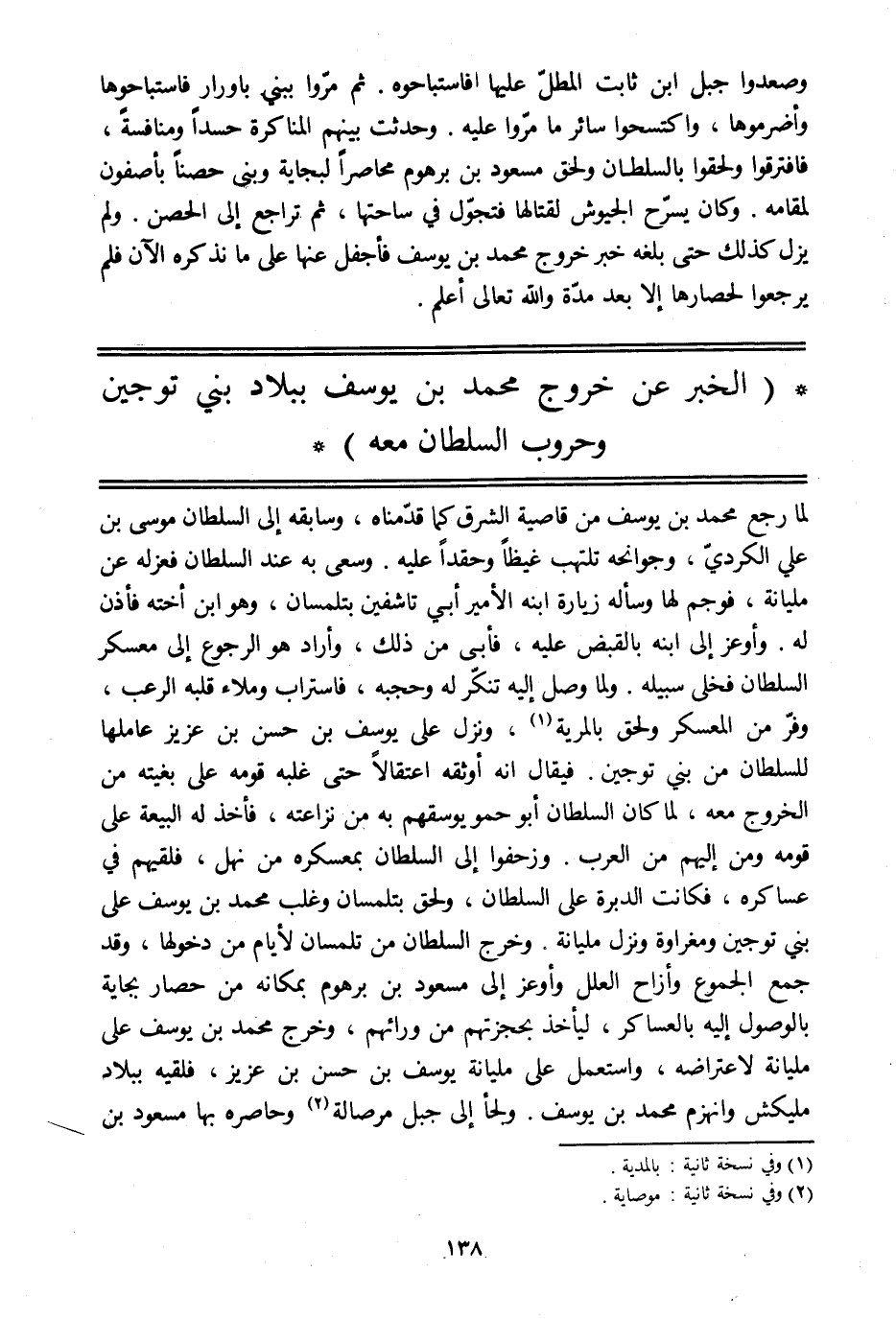 وصعدوا جبل ابن ثابت المطلّ عليها فاستباحوه. ثم مرّوا ببني باورار فاستباحوها وأضرموها، واكتسحوا سائر ما مرّوا عليه. وحدثت بينهم المناكرة حسدا ومنافسة، فافترقوا ولحقوا بالسلطان ولحق مسعود بن برهوم محاصرا لبجاية وبنى حصنا بأصفون لمقامه. وكان يسرّح الجيوش لقتالها فتجوّل في ساحتها، ثم تراجع إلى الحصن. ولم يزل كذلك حتى بلغه خبر خروج محمد بن يوسف فأجفل عنها على ما نذكره الآن فلم يرجعوا لحصارها إلا بعد مدّة والله تعالى أعلم.