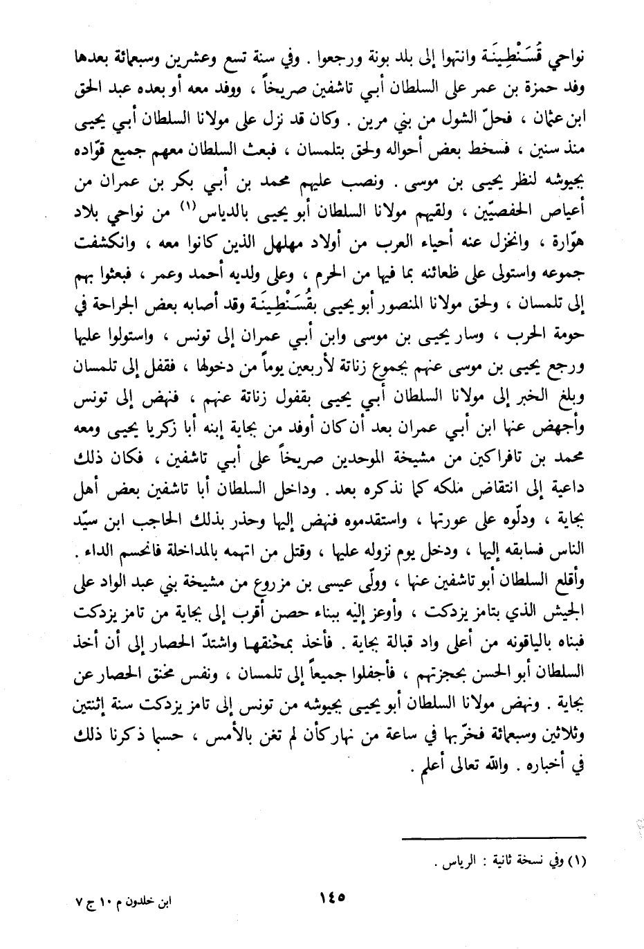نواحي قسنطينة وانتهوا إلى بلد بونة ورجعوا. وفي سنة تسع وعشرين وسبعمائة بعدها وفد حمزة بن عمر على السلطان أبي تاشفين صريخا، ووفد معه أو بعده عبد الحق ابن عثمان، فحلّ الشول من بني مرين. وكان قد نزل على مولانا السلطان أبي يحيى منذ سنين، فسخط بعض أحواله ولحق بتلمسان، فبعث السلطان معهم جميع قوّاده بجيوشه لنظر يحيى بن موسى. ونصب عليهم محمد بن أبي بكر بن عمران من أعياص الحفصيّين، ولقيهم مولانا السلطان أبو يحيى بالدياس [1] من نواحي بلاد هوّارة، وانخزل عنه أحياء العرب من أولاد مهلهل الذين كانوا معه، وانكشفت جموعه واستولى على ظعائنه بما فيها من الحرم، وعلى ولديه أحمد وعمر، فبعثوا بهم إلى تلمسان، ولحق مولانا المنصور أبو يحيى بقسنطينة وقد أصابه بعض الجراحة في حومة الحرب، وسار يحيى بن موسى وابن أبي عمران إلى تونس، واستولوا عليها ورجع يحيى بن موسى عنهم بجموع زناتة لأربعين يوما من دخولها، فقفل إلى تلمسان وبلغ الخبر إلى مولانا السلطان أبي يحيى بقفول زناتة عنهم، فنهض إلى تونس وأجهض عنها ابن أبي عمران بعد أن كان أوفد من بجاية ابنه أبا زكريا يحيى ومعه محمد بن تافراكين من مشيخة الموحدين صريخا على أبي تاشفين، فكان ذلك داعية إلى انتقاض ملكه كما نذكره بعد. وداخل السلطان أبا تاشفين بعض أهل بجاية، ودلّوه على عورتها، واستقدموه فنهض إليها وحذر بذلك الحاجب ابن سيّد الناس فسابقه إليها، ودخل يوم نزوله عليها، وقتل من اتهمه بالمداخلة فانحسم الداء.