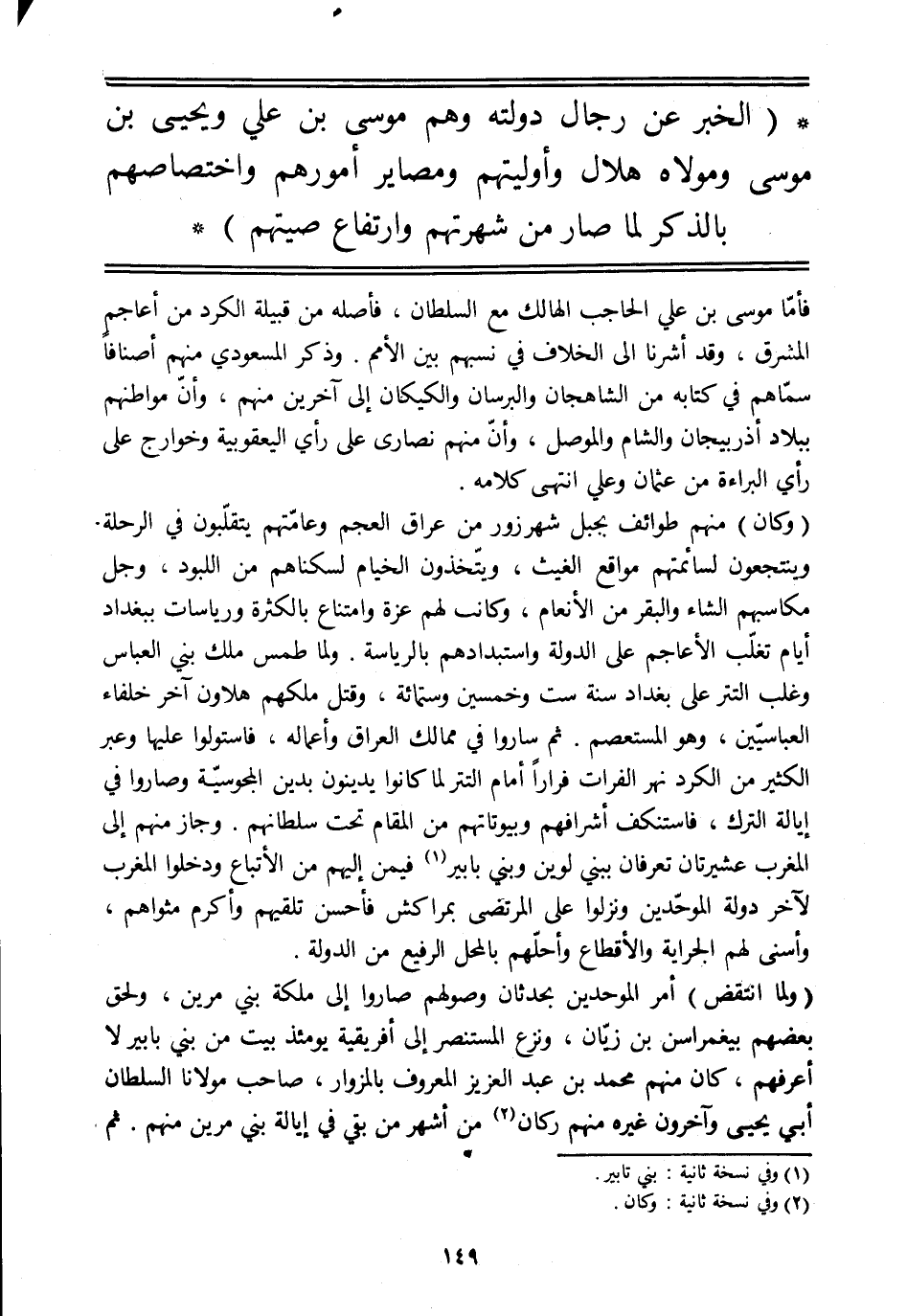 (الخبر عن رجال دولته وهم موسى بن علي ويحيى بن موسى ومولاه هلال وأوليتهم ومصاير أمورهم واختصاصهم بالذكر لما صار من شهرتهم وارتفاع صيتهم)