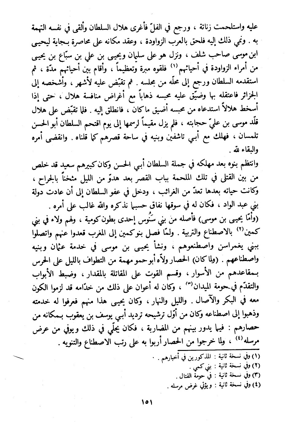 (وأمّا يحيى بن موسى) فأصله من بني سنوس إحدى بطون كومية، ولهم ولاء في بني كمين [2] بالاصطناع والتربية. ولمّا فصل بنو كمين إلى المغرب قعدوا عنهم واتصلوا ببني يغمراسن واصطنعوهم، ونشأ يحيى بن موسى في خدمة عثمان وبنيه واصطناعهم. (ولما كان) الحصار ولّاه أبو حمو مهمة من التطواف بالليل على الحرس بمقاعدهم من الأسوار، وقسم القوت على المقاتلة بالمقدار، وضبط الأبواب والتقدّم في حومة الميدان [3] ، وكان له أعوان على ذلك من خدّامه قد لزموا الكون معه في البكر والآصال. والليل والنهار، وكان يحيى هذا منهم فعرفوا له خدمته وذهبوا إلى اصطناعه وكان من أوّل ترشيحه ترديد أبي يوسف بن يعقوب بمكانه من حصارهم: فيما يدور بينهم من المضاربة، فكان يجلّي في ذلك ويوفي من عرض مرسلة [4] ، ولما خرجوا من الحصار أربوا به على رتب الاصطناع والتنويه.