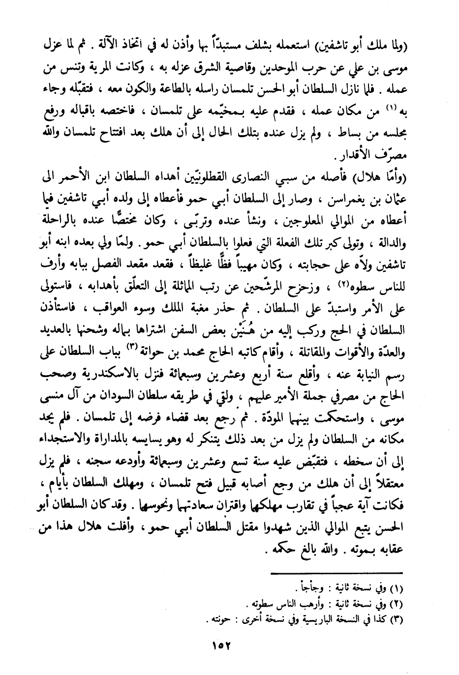 (وأمّا هلال) فأصله من سبي النصارى القطلونيّين أهداه السلطان ابن الأحمر الى عثمان بن يغمراسن، وصار إلى السلطان أبي حمو فأعطاه إلى ولده أبي تاشفين فيما أعطاه من الموالي المعلوجين، ونشأ عنده وتربّى، وكان مختصّا عنده بالراحلة والدالة، وتولى كبر تلك الفعلة التي فعلوا بالسلطان أبي حمو. ولمّا ولي بعده ابنه أبو تاشفين ولّاه على حجابته، وكان مهيبا فظّا غليظا، فقعد مقعد الفصل ببابه وأرف للناس سطوه [2] ، وزحزح المرشّحين عن رتب المماثلة إلى التعلّق بأهدابه، فاستولى على الأمر واستبدّ على السلطان. ثم حذر مغبة الملك وسوء العواقب، فاستأذن السلطان في الحج وركب إليه من هنين بعض السفن اشتراها بماله وشحنها بالعديد والعدّة والأقوات والمقاتلة، وأقام كاتبه الحاج محمد بن حواتة [3] بباب السلطان على رسم النيابة عنه، وأقلع سنة أربع وعشرين وسبعمائة فنزل بالإسكندرية وصحب الحاج من مصرفي جملة الأمير عليهم، ولقي في طريقه سلطان السودان من آل منسي موسى، واستحكمت بينهما المودّة. ثم رجع بعد قضاء فرضه إلى تلمسان. فلم يجد مكانه من السلطان ولم يزل من بعد ذلك يتنكر له وهو يسايسه بالمداراة والاستجداء إلى أن سخطه، فتقبّض عليه سنة تسع وعشرين وسبعمائة وأودعه سجنه، فلم يزل معتقلا إلى أن هلك من وجع أصابه قبيل فتح تلمسان، ومهلك السلطان بأيام، فكانت آية عجبا في تقارب مهلكهما واقتران سعادتهما ونحوسهما. وقد كان السلطان أبو الحسن يتبع الموالي الذين شهدوا مقتل السلطان أبي حمو، وأفلت هلال هذا من عقابه بموته. والله بالغ حكمه.