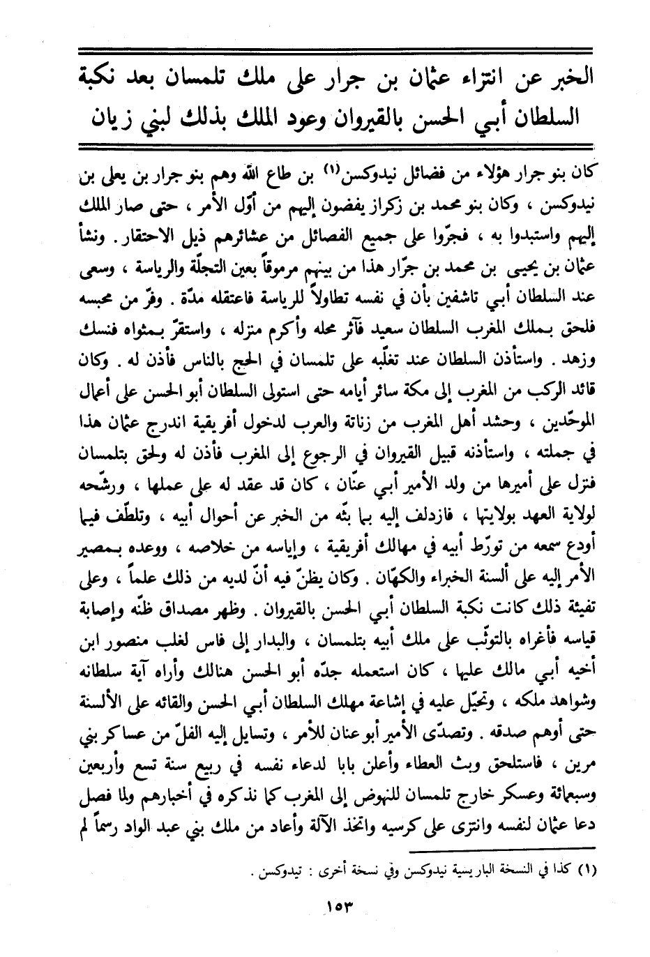 كان بنو جرار هؤلاء من فضائل نيدوكسن [1] بن طاع الله وهم بنو جرار بن يعلى بن نيدوكسن، وكان بنو محمد بن زكراز يفضون إليهم من أوّل الأمر، حتى صار الملك إليهم واستبدوا به، فجرّوا على جميع الفصائل من عشائرهم ذيل الاحتقار. ونشأ عثمان بن يحيى بن محمد بن جرّار هذا من بينهم مرموقا بعين التجلّة والرئاسة، وسعى عند السلطان أبي تاشفين بأن في نفسه تطاولا للرئاسة فاعتقله مدّة. وفرّ من محبسه فلحق بملك المغرب السلطان سعيد فآثر محله وأكرم منزله، واستقرّ بمثواه فنسك وزهد. واستأذن السلطان عند تغلّبه على تلمسان في الحج بالناس فأذن له. وكان قائد الركب من المغرب إلى مكة سائر أيامه حتى استولى السلطان أبو الحسن على أعمال الموحّدين، وحشد أهل المغرب من زناتة والمغرب لدخول إفريقية اندرج عثمان هذا في جملته، واستأذنه قبيل القيروان في الرجوع إلى المغرب فأذن له ولحق بتلمسان فنزل على أميرها من ولد الأمير أبي عنّان، كان قد عقد له على عملها، ورشّحه لولاية العهد بولايتها، فازدلف إليه بما بثّه من الخبر عن أحوال أبيه، وتلطّف فيما أودع سمعه من تورّط أبيه في مهالك إفريقية، وإياسه من خلاصه، ووعده بمصير الأمر إليه على ألسنة الخبراء والكهّان. وكان يظنّ فيه أنّ لديه من ذلك علما، وعلى تفيئة ذلك كانت نكبة السلطان أبي الحسن بالقيروان. وظهر مصداق ظنّه وإصابة قياسه فأغراه بالتوثّب على ملك أبيه بتلمسان، والبدار إلى فاس لغلب منصور ابن أخيه أبي مالك عليها، كان استعمله جدّه أبو الحسن هنالك وأراه آية سلطانه وشواهد ملكه، وتحيّل عليه في إشاعة مهلك السلطان أبي الحسن وإلقائه على الألسنة حتى أوهم صدقه. وتصدّى الأمير أبو عنان للأمر، وتسايل إليه الفلّ من عساكر بني مرين، فاستلحق وبث العطاء وأعلن بابا لدعاء نفسه في ربيع سنة تسع وأربعين وسبعمائة وعسكر خارج تلمسان للنهوض إلى المغرب كما نذكره في أخبارهم ولما فصل دعا عثمان لنفسه وانتزى على كرسيه واتخذ الآلة وأعاد من ملك بني عبد الواد رسما لم