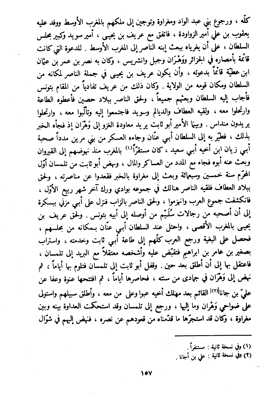 كلّه، ورجوع بني عبد الواد ومغراوة وتوجين إلى ملكهم بالمغرب الأوسط ووفد عليه يعقوب بن علي أمير الزواودة، فاتفق مع عريف بن يحيى، أمير سويد وكبير مجلس السلطان، على أن يغرياه ببعث ابنه الناصر إلى المغرب الأوسط. للدعوة التي كانت قائمة بأمصاره في الجزائر ووهران وجبل وانشريس، وكان به نصر بن عمر بن عثمان ابن عطيّة قائما بدعوته، وأن يكون عريف بن يحيى في جملة الناصر لمكانه من السلطان ومكان قومه من الولاية. وكان ذلك من عريف تفاديا من المقام بتونس فأجاب إليه السلطان وبعثهم جميعا، ولحق الناصر ببلاد حصين فأعطوه الطاعة وارتحلوا معه، ولقيه العطاف والديالم وسويد فاجتمعوا إليه وتألّبوا معه، وارتحلوا يريدون منداس. وبينما الأمير أبو ثابت يريد معاودة الغزو إلى وهران إذ فجأه الخبر بذلك، فطيّر به إلى السلطان أبي عنّان وجاءه العسكر من بني مرين مددا صحبة أبي زيان ابن أخيه أبي سعيد، كان مستقرّا [1] بالمغرب منذ نهوضهم إلى القيروان وبعث عنه أبوه فجاء مع المدد من العساكر والمال، ونهض أبو ثابت من تلمسان أوّل المحرّم سنة خمسين وسبعمائة وبعث إلى مغراوة بالخبر فقعدوا عن مناصرته، ولحق ببلاد العطاف فلقيه الناصر هنالك في جموعه بوادي ورك آخر شهر ربيع الأوّل، فانكشفت جموع العرب وانهزموا، ولحق الناصر بالزاب فنزل على أبي مزني ببسكرة إلى أن أصحبه من رجالات سليم من أوصله إلى أبيه بتونس. ولحق عريف بن يحيى بالمغرب الأقصى، واحتل عند السلطان أبي عنّان بمكانه من مجلسهم، فحصل على البغية ورجع العرب كلّهم إلى طاعة أبي ثابت وخدمته، واستراب بصغير بن عامر بن إبراهيم فتقبّض عليه وأشخصه معتقلا مع البريد إلى تلمسان، فاعتقل بها إلى أن أطلق بعد حين. وقفل أبو ثابت إلى تلمسان فتلوم بها أياما، ثم نهض إلى وهران في جمادى من سنته، فحاصرها أياما، ثم افتتحها عنوة وعفا عن عليّ بن جانا [2] القائم بعد مهلك أخيه عبو وعلى من معه، وأطلق سبيلهم واستولى على ضواحي وهران وما إليها، ورجع إلى تلمسان وقد استحكمت العداوة بينه وبين مغراوة، وكان قد استجرّها ما قدّمناه من قعودهم عن نصره، فنهض إليهم في شوّال