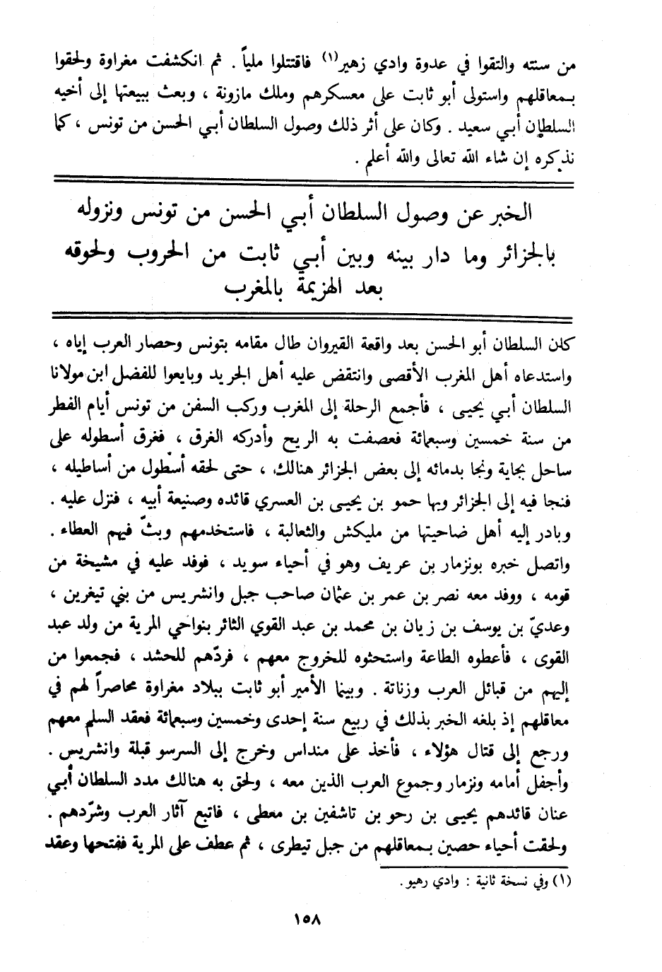 من سنته والتقوا في عدوة وادي زهير [1] فاقتتلوا مليا. ثم انكشفت مغراوة ولحقوا بمعاقلهم واستولى أبو ثابت على معسكرهم وملك مازونة، وبعث ببيعتها إلى أخيه السلطان أبي سعيد. وكان على أثر ذلك وصول السلطان أبي الحسن من تونس، كما نذكره إن شاء الله تعالى والله أعلم.