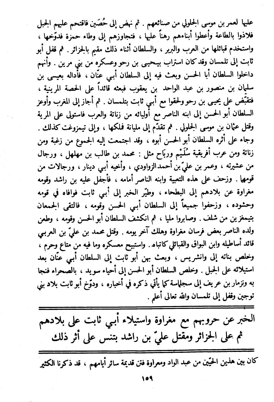 عليها لعمر بن موسى الجلولي من صنائعهم. ثم نهض إلى حصين فاقتحم عليهم الجبل فلاذوا بالطاعة وأعطوا أبناءهم رهنا عليها، فتجاوزهم إلى وطاء حمزة فدوّخها، واستخدم قبائلها من العرب والبربر، والسلطان أثناء ذلك مقيم بالجزائر. ثم قفل أبو ثابت إلى تلمسان وقد كان استراب بيحيى بن رحو وعسكره من بني مرين. وأنهم داخلوا السلطان أبا الحسن وبعث فيه إلى السلطان أبي عنّان، فأداله بعيسى بن سليمان بن منصور بن عبد الواحد بن يعقوب فبعثه قائدا على الحصة المرينية، فتقبّض على يحيى بن رحو ولحقوا مع أبي ثابت بتلمسان. ثم أجاز إلى المغرب وأوعز السلطان أبو الحسن إلى ابنه الناصر مع أوليائه من زناتة والعرب فاستولى على المرية وقتل عثمان بن موسى الجلولي. ثم تقدّم إلى مليانة فملكها، وإلى تيمزوغت كذلك.