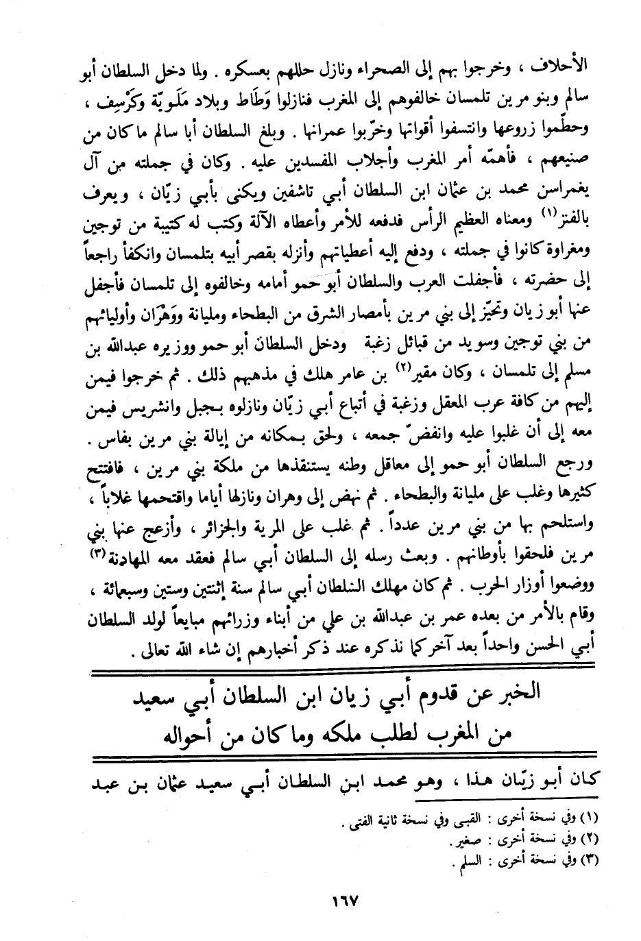 الأحلاف، وخرجوا بهم إلى الصحراء ونازل حللهم بعسكره. ولما دخل السلطان أبو سالم وبنو مرين تلمسان خالفوهم إلى المغرب فنازلوا وطاط وبلاد ملويّة وكرسف، وحطّموا زروعها وانتسفوا أقواتها وخرّبوا عمرانها. وبلغ السلطان أبا سالم ما كان من صنيعهم، فأهمّه أمر المغرب وأجلاب المفسدين عليه. وكان في جملته من آل يغمراسن محمد بن عثمان ابن السلطان أبي تاشفين ويكنى بأبي زيّان، ويعرف بالفنز [1] ومعناه العظيم الرأس فدفعه للأمر وأعطاه الآلة وكتب له كتيبة من توجين ومغراوة كانوا في جملته، ودفع إليه أعطياتهم وأنزله بقصر أبيه بتلمسان وانكفأ راجعا إلى حضرته، فأجفلت العرب والسلطان أبو حمو أمامه وخالفوه إلى تلمسان فأجفل عنها أبو زيان وتحيّز إلى بني مرين بأمصار الشرق من البطحاء ومليانة ووهران وأوليائهم من بني توجين وسويد من قبائل زغبة ودخل السلطان أبو حمو ووزيره عبد الله بن مسلم إلى تلمسان، وكان مقير [2] بن عامر هلك في مذهبهم ذلك. ثم خرجوا فيمن إليهم من كافة عرب المعقل وزغبة في أتباع أبي زيّان ونازلوه بجبل وانشريس فيمن معه إلى أن غلبوا عليه وانفضّ جمعه، ولحق بمكانه من إيالة بني مرين بفاس.