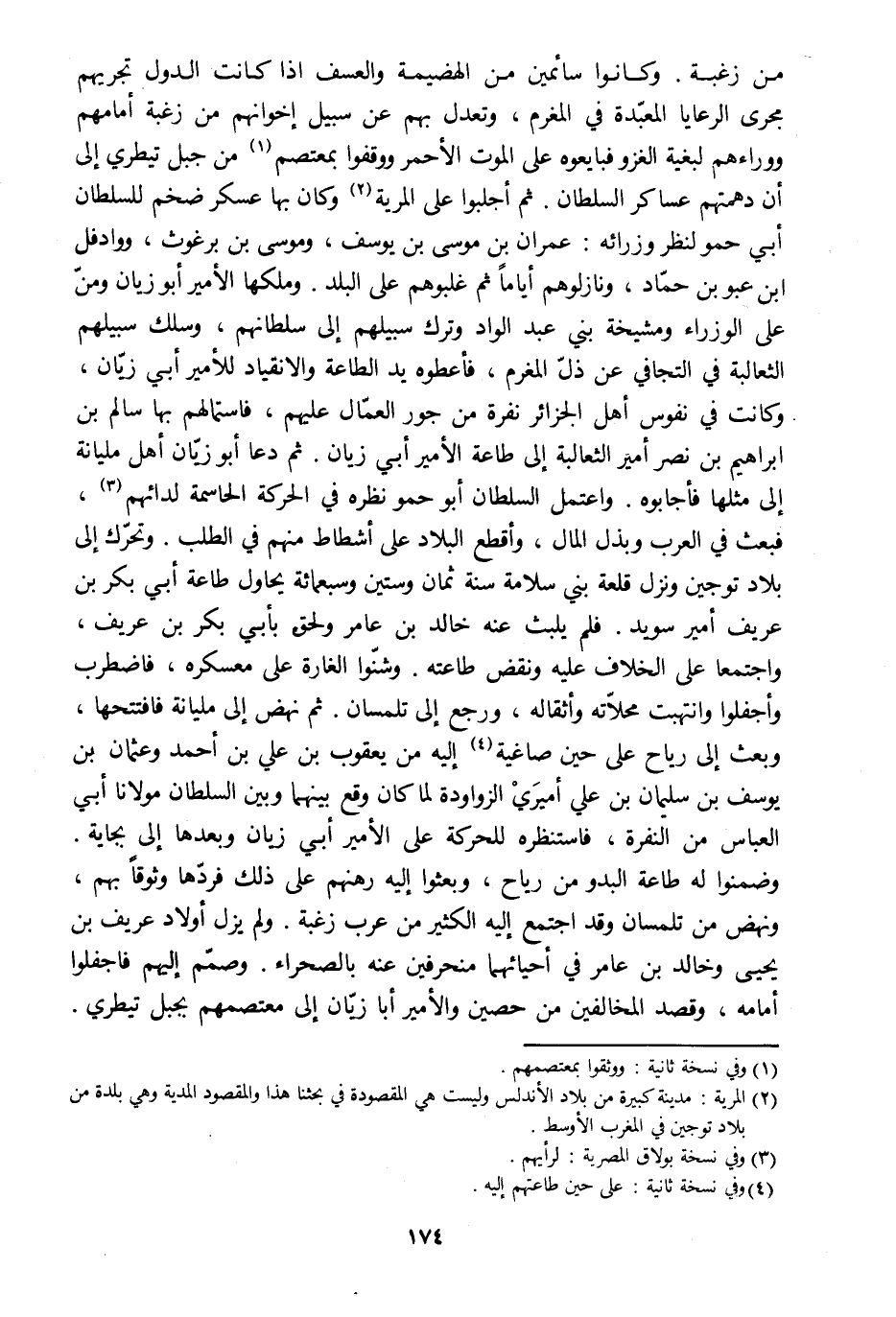 من زغبة. وكانوا سائمين من الهضيمة والعسف إذا كانت الدول تجريهم مجرى الرعايا المعبّدة في المغرم، وتعدل بهم عن سبيل إخوانهم من زغبة أمامهم ووراءهم لبغية الغزو فبايعوه على الموت الأحمر ووقفوا بمعتصم [1] من جبل تيطري إلى أن دهمتهم عساكر السلطان. ثم أجلبوا على المرية [2] وكان بها عسكر ضخم للسلطان أبي حمو لنظر وزرائه: عمران بن موسى بن يوسف، وموسى بن برغوث، ووادفل ابن عبو بن حمّاد، ونازلوهم أياما ثم غلبوهم على البلد. وملكها الأمير أبو زيان ومن على الوزراء ومشيخة بني عبد الواد وترك سبيلهم إلى سلطانهم، وسلك سبيلهم الثعالبة في التجافي عن ذلّ المغرم، فأعطوه يد الطاعة والانقياد للأمير أبي زيّان، وكانت في نفوس أهل الجزائر نفرة من جور العمّال عليهم، فاستمالهم بها سالم بن إبراهيم بن نصر أمير الثعالبة إلى طاعة الأمير أبي زيان. ثم دعا أبو زيّان أهل مليانة إلى مثلها فأجابوه. واعتمل السلطان أبو حمو نظره في الحركة الحاسمة لدائهم [3] ، فبعث في العرب وبذل المال، وأقطع البلاد على أشطاط منهم في الطلب. وتحرّك إلى بلاد توجين ونزل قلعة بني سلامة سنة ثمان وستين وسبعمائة يحاول طاعة أبي بكر بن عريف أمير سويد. فلم يلبث عنه خالد بن عامر ولحق بأبي بكر بن عريف، واجتمعا على الخلاف عليه ونقض طاعته. وشنّوا الغارة على معسكره، فاضطرب وأجفلوا وانتهبت محلّاته وأثقاله، ورجع إلى تلمسان. ثم نهض إلى مليانة فافتتحها، وبعث إلى رياح على حين صاغية [4] إليه من يعقوب بن علي بن أحمد وعثمان بن يوسف بن سليمان بن علي أميري الزواودة لما كان وقع بينهما وبين السلطان مولانا أبي العباس من النفرة، فاستنظره للحركة على الأمير أبي زيان وبعدها إلى بجاية.