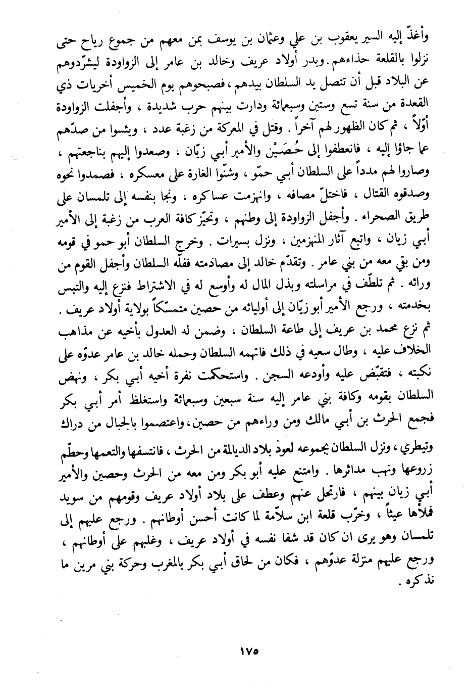 وأغذّ إليه السير يعقوب بن علي وعثمان بن يوسف بمن معهم من جموع رياح حتى نزلوا بالقلعة حذاءهم. وبدر أولاد عريف وخالد بن عامر إلى الزواودة ليشرّدوهم عن البلاد قبل أن تتصل يد السلطان بيدهم، فصبحوهم يوم الخميس أخريات ذي القعدة من سنة تسع وستين وسبعمائة ودارت بينهم حرب شديدة، وأجفلت الزواودة أوّلا، ثم كان الظهور لهم آخرا. وقتل في المعركة من زغبة عدد، ويئسوا من صدّهم عما جاءوا إليه، فانعطفوا إلى حصين والأمير أبي زيّان، وصعدوا إليهم بناجعتهم، وصاروا لهم مددا على السلطان أبي حمّو، وشنّوا الغارة على معسكره، فصمدوا نحوه وصدقوه القتال، فاختلّ مصافه، وانهزمت عساكره، ونجا بنفسه إلى تلمسان على طريق الصحراء. وأجفل الزواودة إلى وطنهم، وتحيّز كافة العرب من زغبة إلى الأمير أبي زيان، واتبع آثار المنهزمين، ونزل بسيرات. وخرج السلطان أبو حمو في قومه ومن بقي معه من بني عامر. وتقدّم خالد إلى مصادمته ففلّه السلطان وأجفل القوم من ورائه. ثم تلطّف في مراسلته وبذل المال له وأوسع له في الاشتراط فنزع إليه والتبس بخدمته، ورجع الأمير أبو زيّان إلى أوليائه من حصين متمسّكا بولاية أولاد عريف.