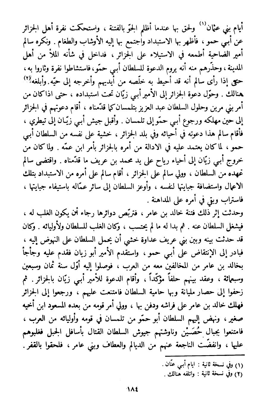 أيام بني عثمان [1] ولحق بها عند ما أظلم الجوّ بالفتنة، واستحكمت نفرة أهل الجزائر عن أبي حمو، فأظهر بها الاستبداد واجتمع بها إليه الأوشاب والطغام. ونكره سالم أمير الضاحية أطمعه في الاستيلاء على الجزائر، فداخل في شأنه الملأ من أهل المدينة، وحذّرهم منه أنه يروم الدعوة للسلطان أبي حمّو، فاستشاطوا نفرة وثاروا به، حتى إذا رأى سالم أنه قد أحيط به خلّصه من أيديهم وأخرجه إلى حيّه. وأبلغه [2] هنالك. وحوّل دعوة الجزائر إلى الأمير أبي زيّان تحت استبداده، حتى إذا كان من أمر بني مرين وحلول السلطان عبد العزيز بتلمسان كما قدّمناه، أقام دعوتهم في الجزائر إلى حين مهلكه ورجوع أبي حمّو إلى تلمسان. وأقبل جيش أبي زيّان إلى تيطري، فأقام سالم هذا دعوته في أحيائه وفي بلد الجزائر، خشية على نفسه من السلطان أبي حمو، لما كان يعتمد عليه في الادالة من أمره بالجزائر بأمر ابن عمّه. ولما كان من خروج أبي زيّان إلى أحياء رياح على يد محمد بن عريف ما قدّمناه. واقتضى سالم عهده من السلطان، وولي سالم على الجزائر، أقام سالم على أمره من الاستبداد بتلك الأعمال واستضافة جبايتها لنفسه، وأوعز السلطان إلى سائر عمّاله باستيفاء جبايتها، فاستراب وبقي في أمره على المداهنة.