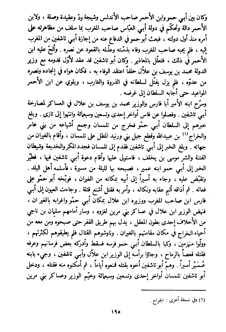 وتقبّض عليه، وجاء به أسيرا إلى أبيه بمكانه من الغيران، فوبّخه أبو حمّو على فعاله. ثم أذاقه أليم عقابه ونكاله، وأمر به فقتل أشنع قتلة. وجاءت العيون إلى أبي فارس ابن صاحب المغرب ووزيره ابن علال بمكان أبي حمّو واغرابه بالغيران، فنهض الوزير ابن علال في عساكر بني مرين لغزوه، وسار أمامهم سليمان بن ناجي من الأحلاف إحدى بطون المعقل، يدل بهم طريق القفر حتى صبحوه ومن معه من أحياء الخراج في مكان مقامتهم بالغيران. وناوشوهم القتال فلم يطيقوهم لكثرتهم، وولّوا منهزمين، وكبا بالسلطان أبي حمو فرسه فسقط وأدركه بعض فرسانهم وعرفه فقتله قعصا بالرماح، وجاءوا برأسه إلى الوزير ابن علّال وأبي تاشفين، وجيء بابنه عمير أسيرا. وهمّ أبو تاشفين أخوه بقتله فمنعوه أياما، ثم أمكنوه منه فقتله، ودخل أبو تاشفين تلمسان أواخر إحدى وتسعين وسبعمائة وخيّم الوزير وعساكر بني مرين