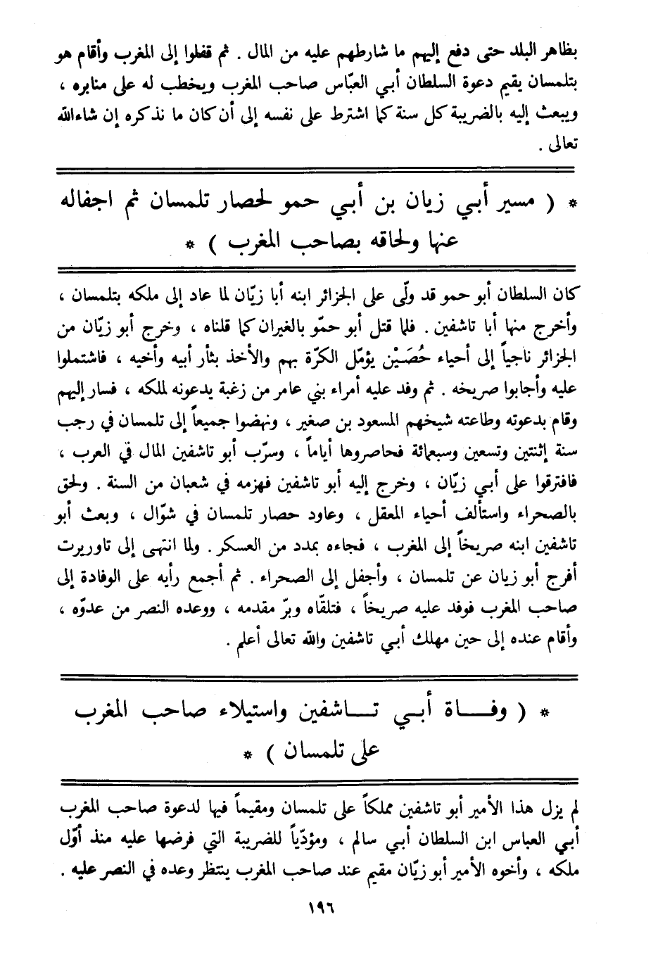 بظاهر البلد حتى دفع إليهم ما شارطهم عليه من المال. ثم قفلوا إلى المغرب وأقام هو بتلمسان يقيم دعوة السلطان أبي العبّاس صاحب المغرب ويخطب له على منابره، ويبعث إليه بالضريبة كل سنة كما اشترط على نفسه إلى أن كان ما نذكره إن شاء الله تعالى.