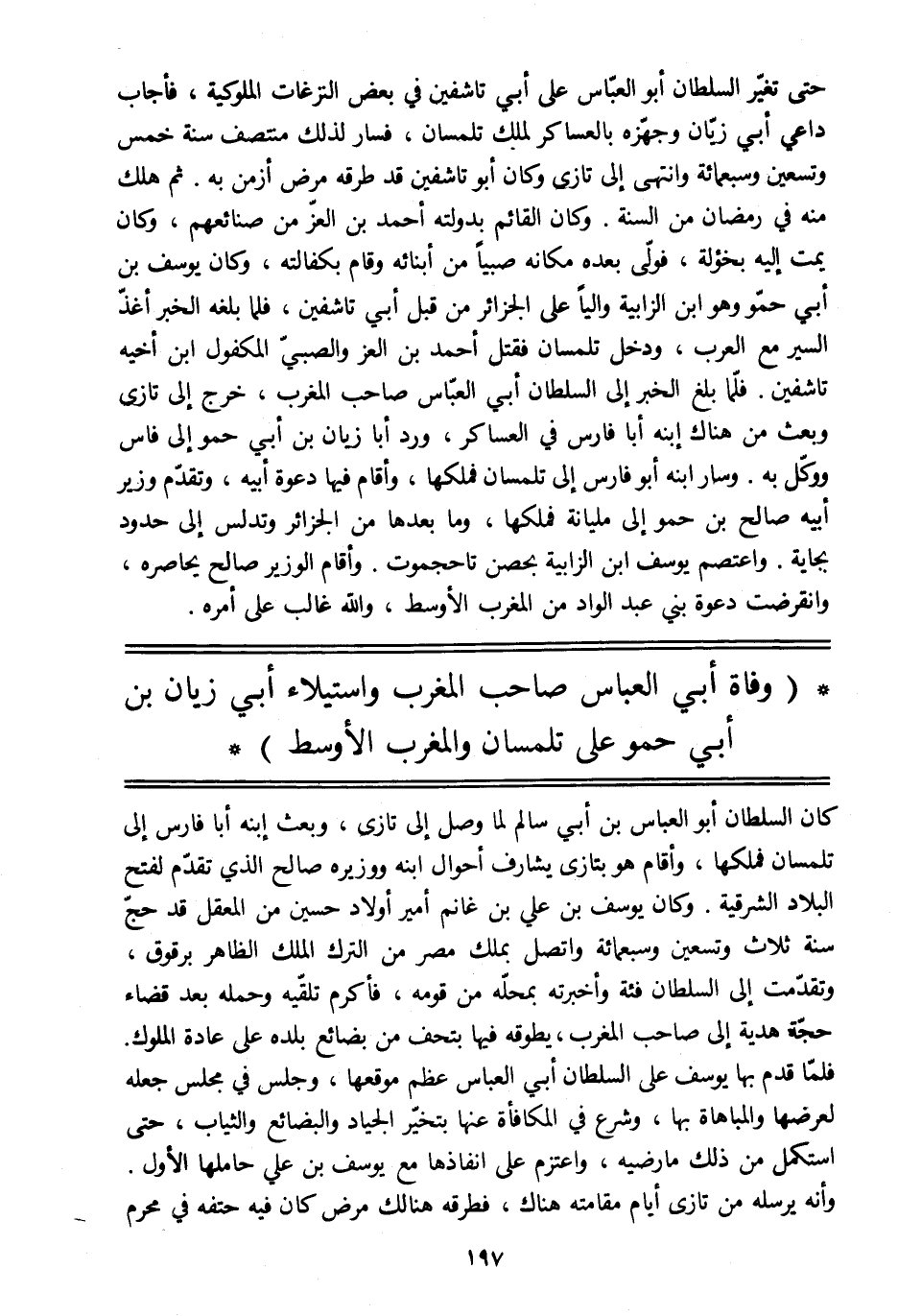 حتى تغيّر السلطان أبو العبّاس على أبي تاشفين في بعض النزغات الملوكية، فأجاب داعي أبي زيّان وجهّزه بالعساكر لملك تلمسان، فسار لذلك منتصف سنة خمس وتسعين وسبعمائة وانتهى إلى تازي وكان أبو تاشفين قد طرقه مرض أزمن به. ثم هلك منه في رمضان من السنة. وكان القائم بدولته أحمد بن العزّ من صنائعهم، وكان يمت إليه بخؤولة، فولّى بعده مكانه صبيا من أبنائه وقام بكفالته، وكان يوسف بن أبي حمّو وهو ابن الزابية واليا على الجزائر من قبل أبي تاشفين، فلما بلغه الخبر أغذّ السير مع العرب، ودخل تلمسان فقتل أحمد بن العز والصبيّ المكفول ابن أخيه تاشفين. فلمّا بلغ الخبر إلى السلطان أبي العبّاس صاحب المغرب، خرج إلى تازى وبعث من هناك ابنه أبا فارس في العساكر، ورد أبا زيان بن أبي حمو إلى فاس ووكّل به. وسار ابنه أبو فارس إلى تلمسان فملكها، وأقام فيها دعوة أبيه، وتقدّم وزير أبيه صالح بن حمو إلى مليانة فملكها، وما بعدها من الجزائر وتدلس إلى حدود بجاية. واعتصم يوسف ابن الزابية بحصن تاحجموت. وأقام الوزير صالح يحاصره، وانقرضت دعوة بني عبد الواد من المغرب الأوسط، والله غالب على أمره.