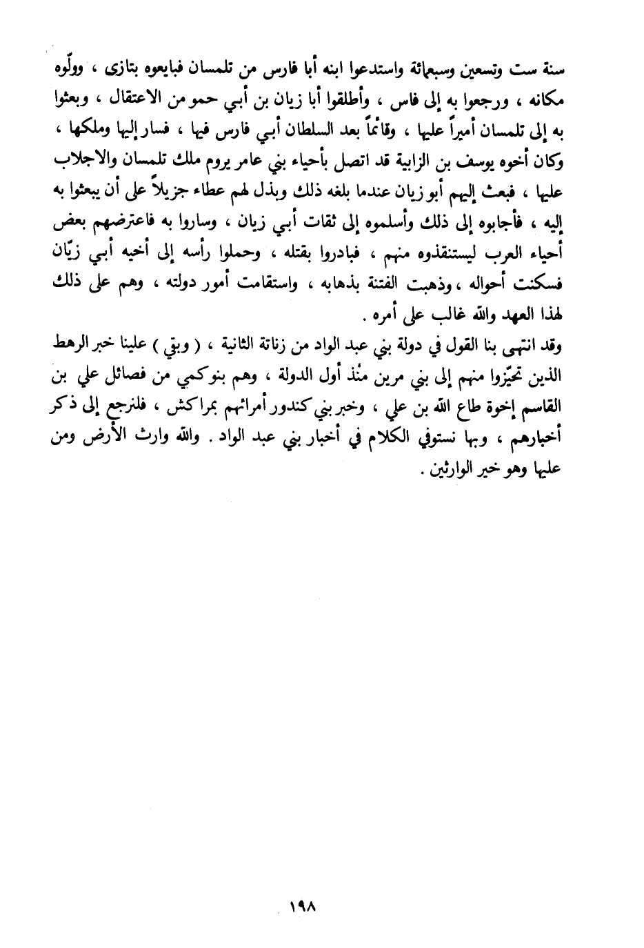 وقد انتهى بنا القول في دولة بني عبد الواد من زناتة الثانية، (وبقي) علينا خبر الرهط الذين تحيّزوا منهم إلى بني مرين منذ أول الدولة، وهم بنو كمي من فصائل علي بن القاسم إخوة طاع الله بن علي، وخبر بني كندور أمرائهم بمراكش، فلنرجع إلى ذكر أخبارهم، وبها نستوفي الكلام في أخبار بني عبد الواد. والله وارث الأرض ومن عليها وهو خير الوارثين