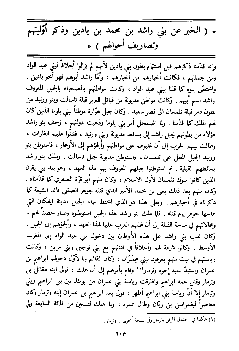 وإنما قدّمنا ذكرهم قبل استتمام بطون بني يادين لأنهم لم يزالوا أحلافا لبني عبد الواد ومن جملتهم، فكانت أخبارهم من أخبارهم، وأمّا راشد أبوهم فهو أخو يادين.