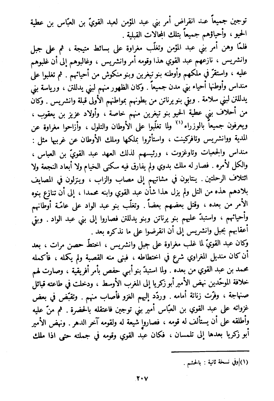 منداس والجعبات وتاوغزوت، ورئيسهم لذلك العهد عبد القويّ بن العبّاس، والكل لأمره. فصار له ملك بدوي ولم يفارق فيه سكنى الخيام ولا أبعاد النجعة ولا ائتلاف الرحلتين. ينتابون في مشاتيهم إلى مصاب والزاب، وينزلون في المصايف بلادهم هذه من التل ولم يزل هذا شأن عبد القوي وابنه محمدا، إلى أن تنازع بنوه الأمر من بعده، وقتل بعضهم بعضا. وتغلّب بنو عبد الواد على عامّة أوطانهم وأحيائهم، واستبدّ عليهم بنو يرناتن وبنو يدللتن فصاروا إلى بني عبد الواد. وبقي أعقابهم بجبل وانشريس إلى أن انقرضوا على ما نذكره بعد.