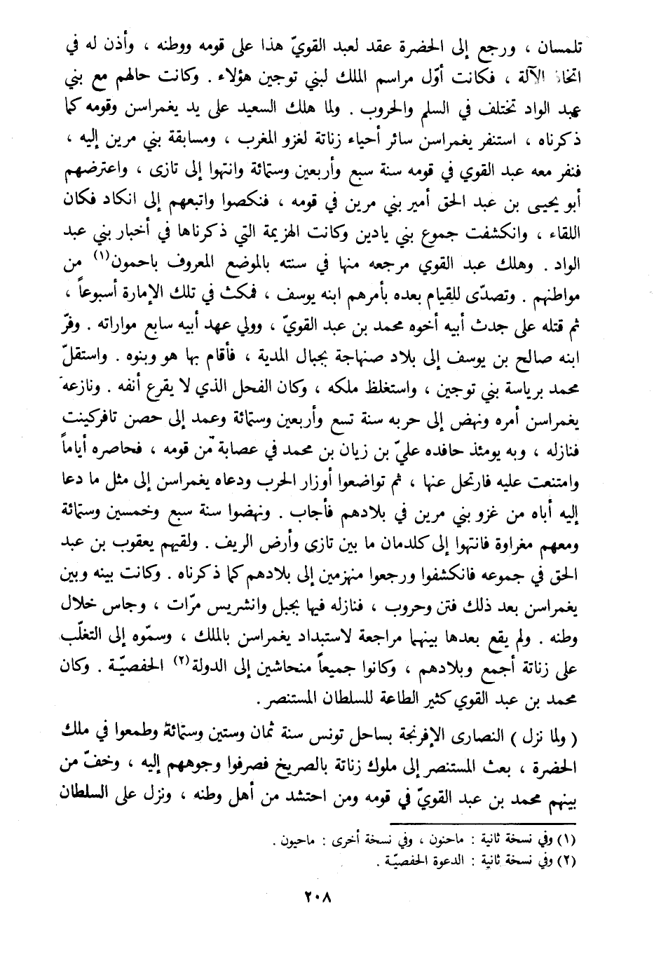 (ولما نزل) النصارى الإفرنجة بساحل تونس سنة ثمان وستين وستمائة وطمعوا في ملك الحضرة، بعث المستنصر إلى ملوك زناتة بالصريخ فصرفوا وجوههم إليه، وخفّ من بينهم محمد بن عبد القويّ في قومه ومن احتشد من أهل وطنه، ونزل على السلطان