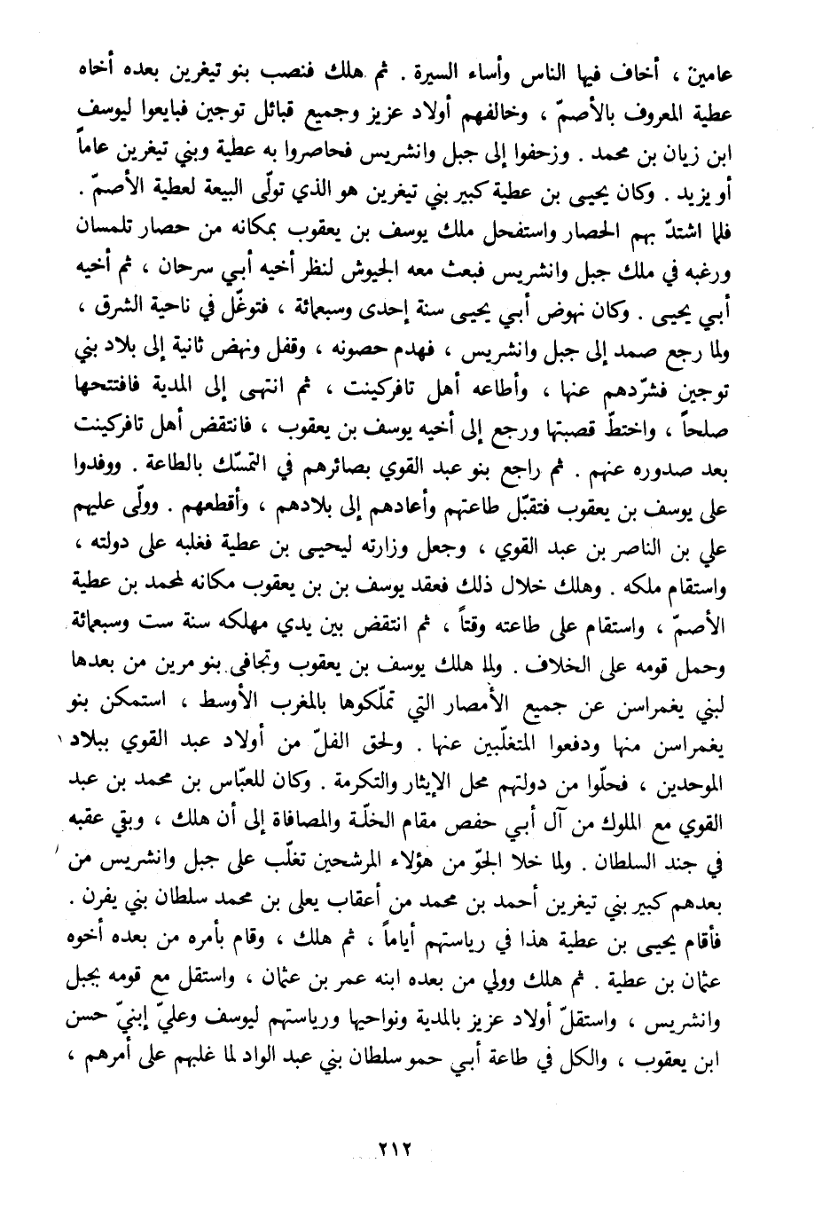عامين، أخاف فيها الناس وأساء السيرة. ثم هلك فنصب بنو تيغرين بعده أخاه عطية المعروف بالأصمّ، وخالفهم أولاد عزيز وجميع قبائل توجين فبايعوا ليوسف ابن زيان بن محمد. وزحفوا إلى جبل وانشريس فحاصروا به عطية وبني تيغرين عاما أو يزيد. وكان يحيى بن عطية كبير بني تيغرين هو الّذي تولّى البيعة لعطية الأصمّ.